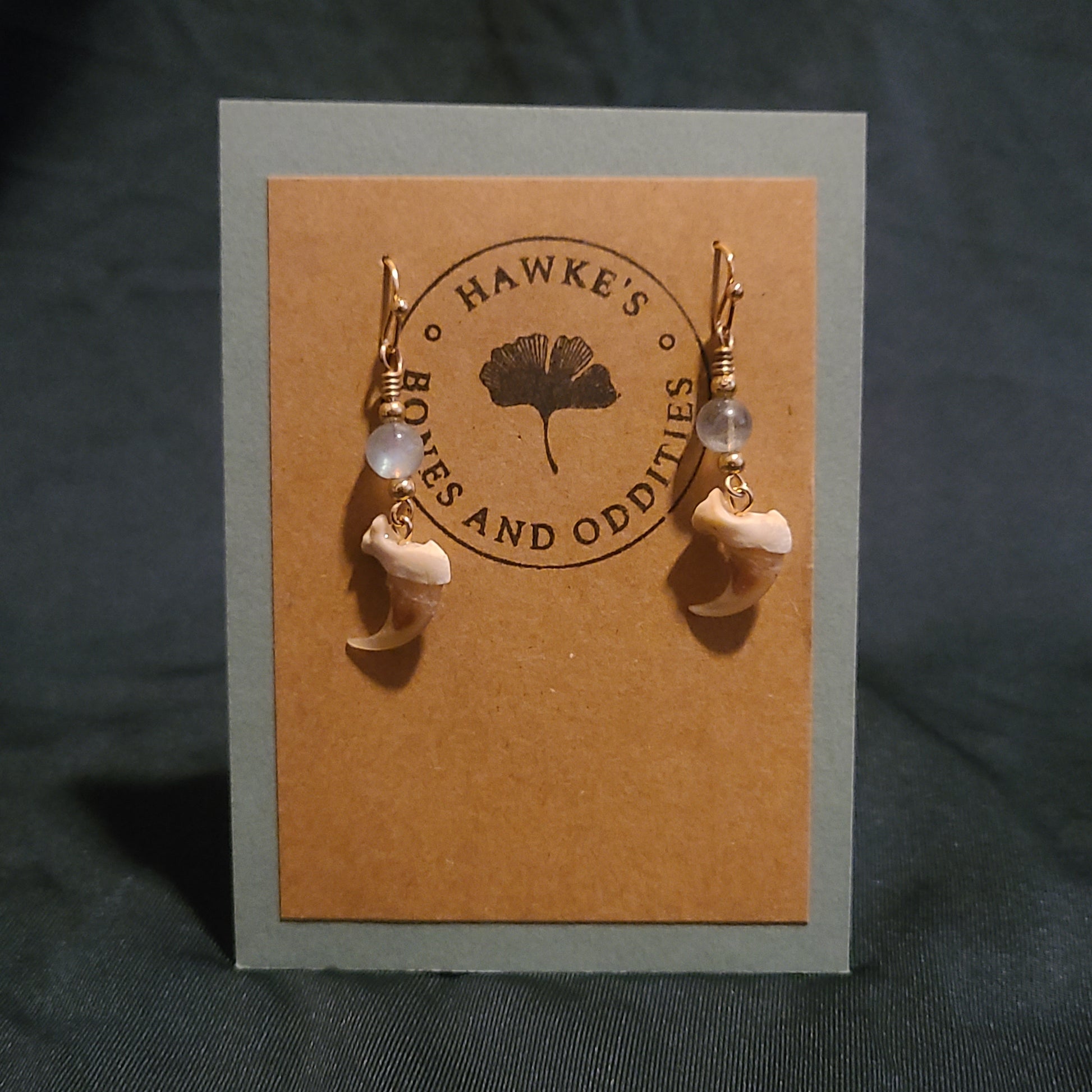 Handmade oddity bobcat claw dangle earrings with labradorite stones. Silver tone nickle-free stainless steel earwires with silicone ear nuts.