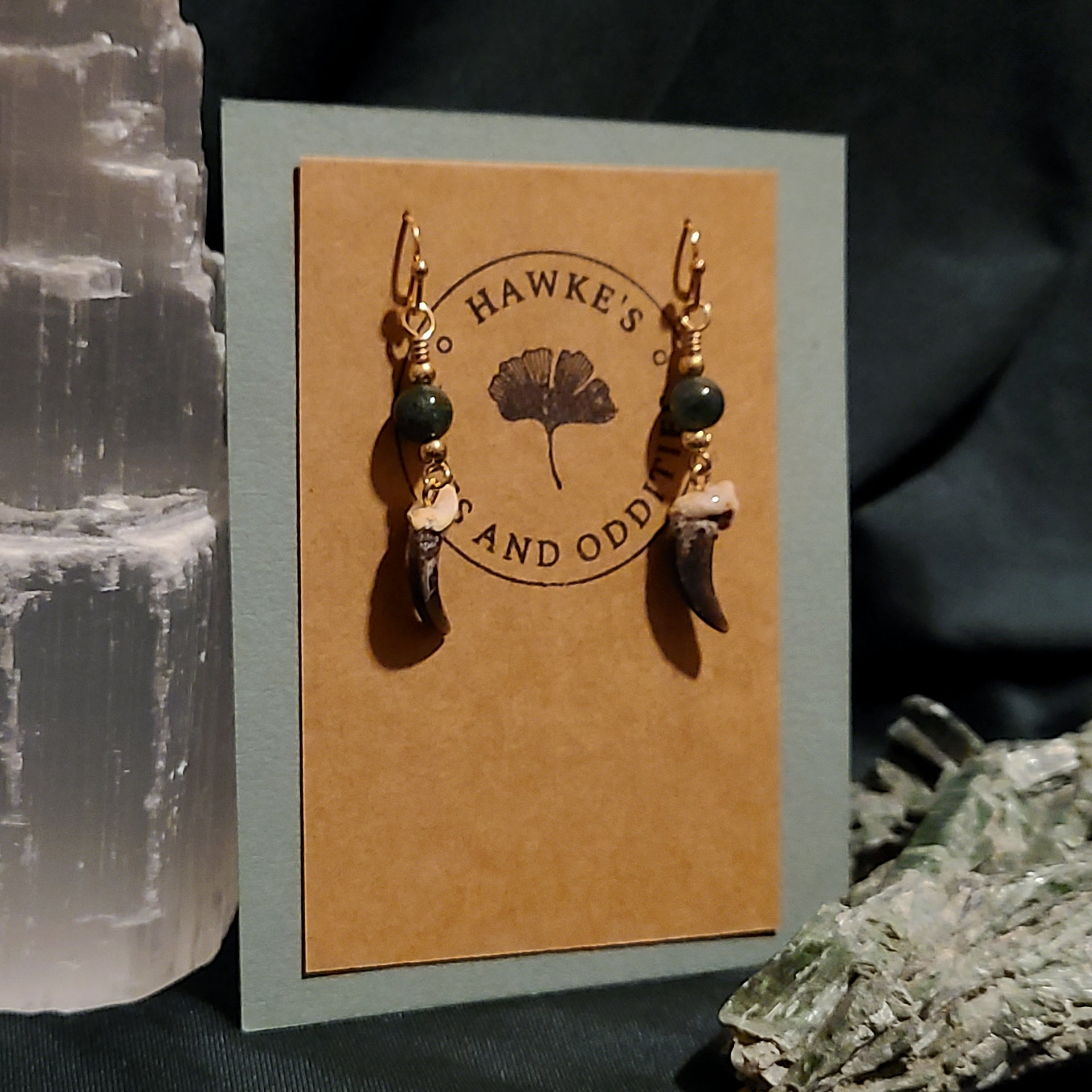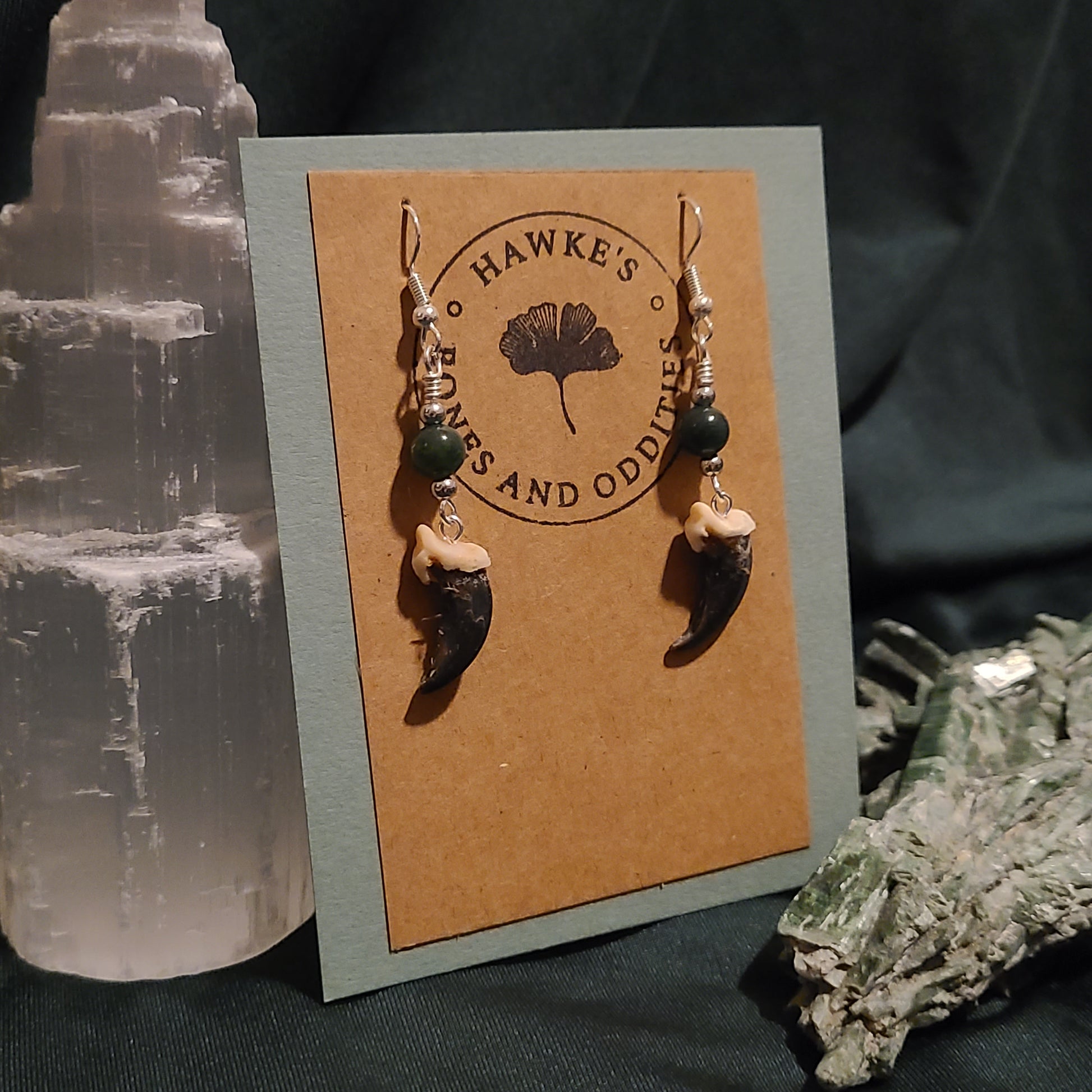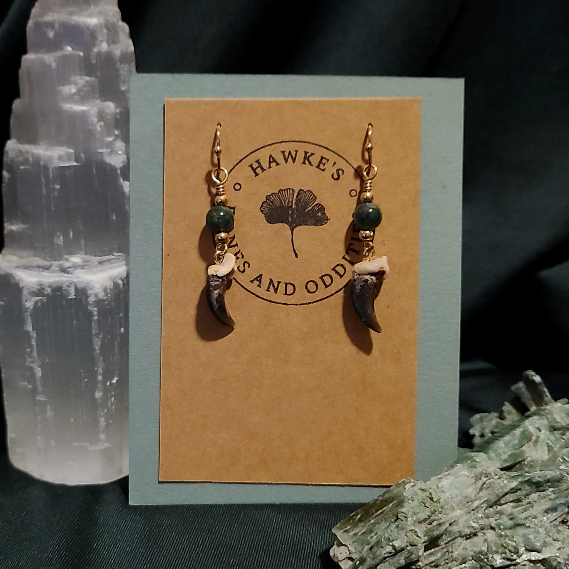 Handmade oddity coyote claw dangle earrings with moss agate. Available with nickle-free gold or silver tone steel earwires with silicone stops.