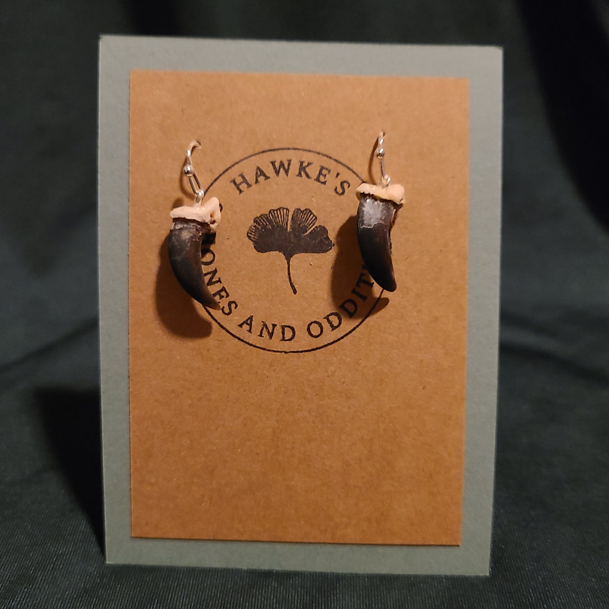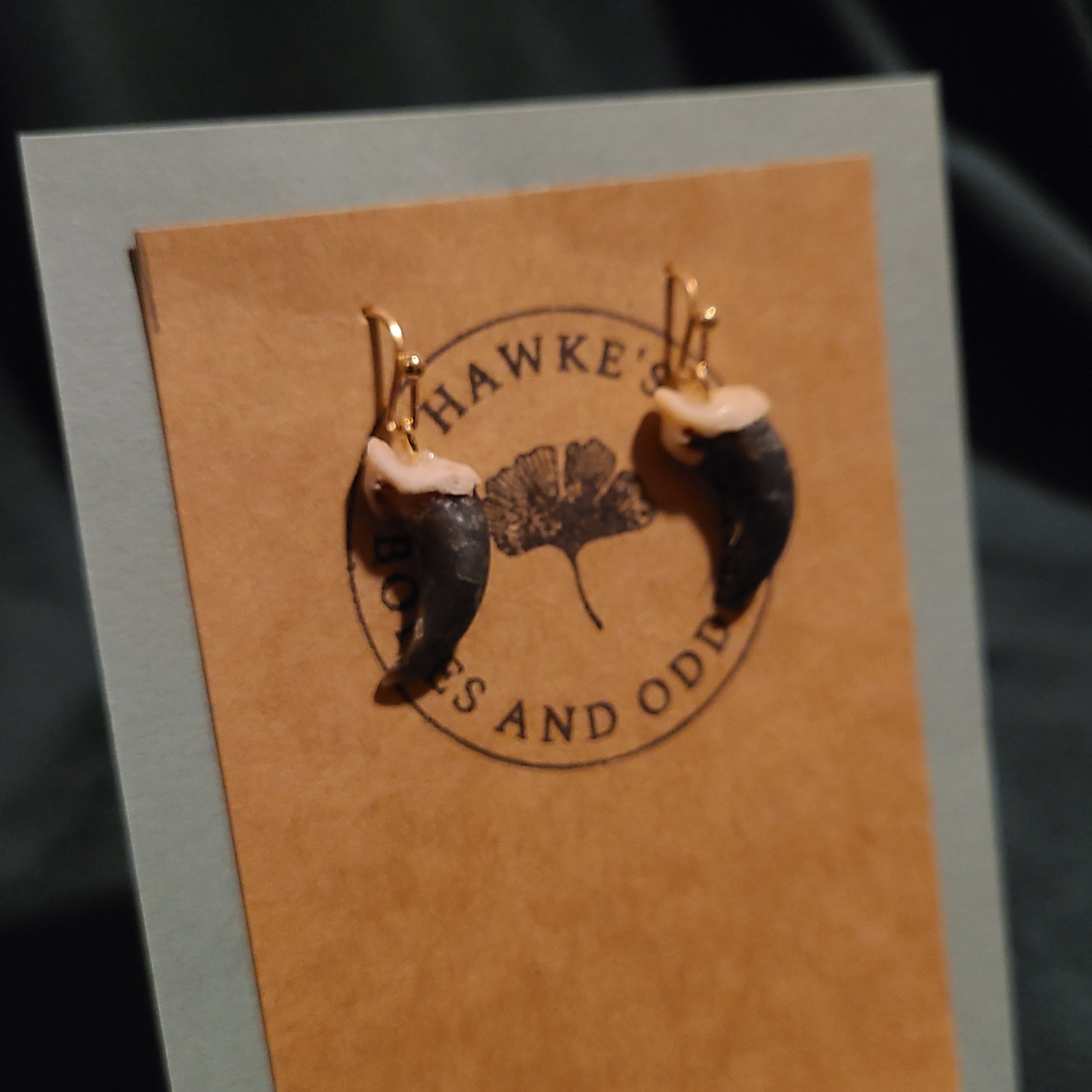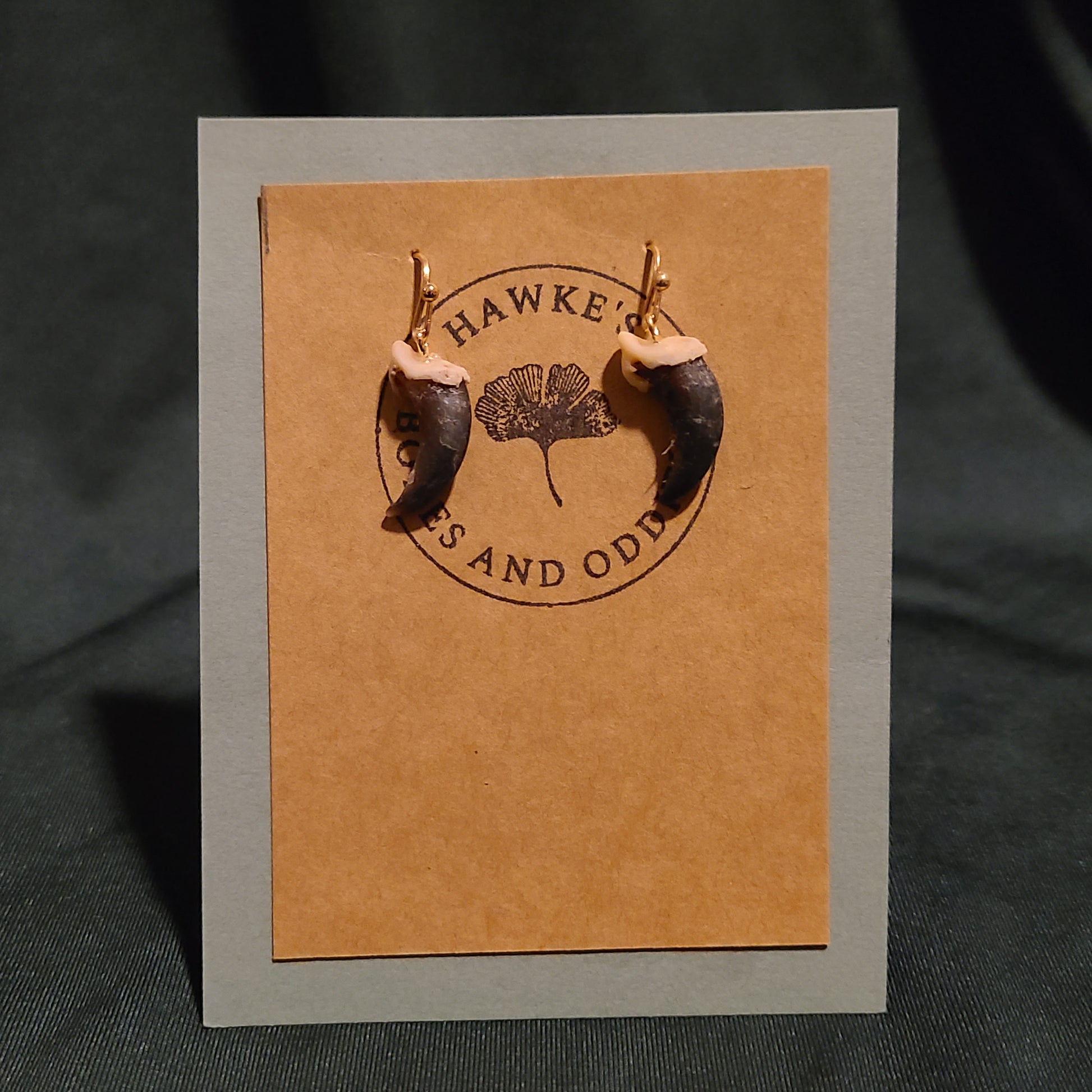 Handmade coyote claw dangle earrings. Claws vary in length between .5 in and .75 in. Hypoallergenic hook earrings with silicone stops. Available in either gold or silver.