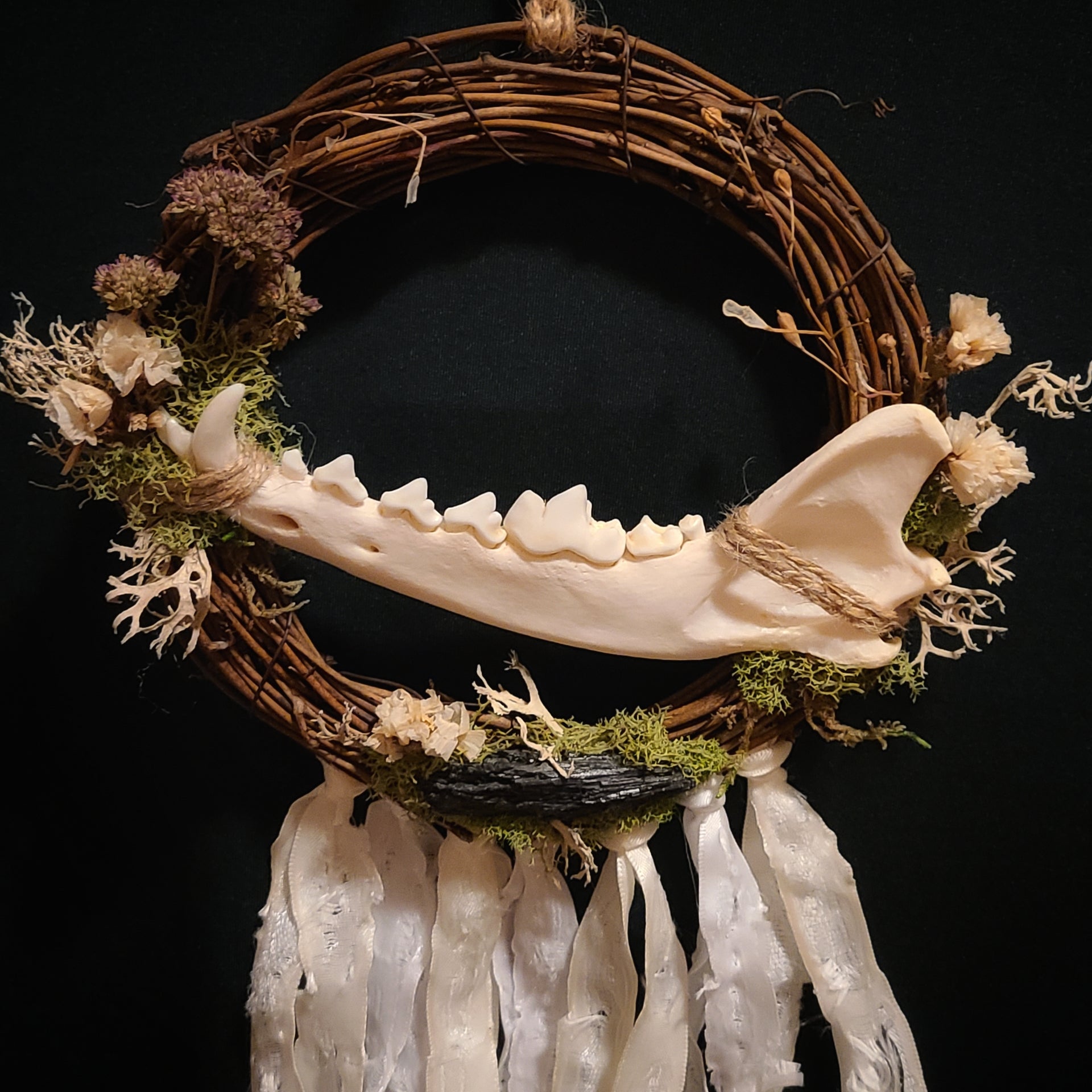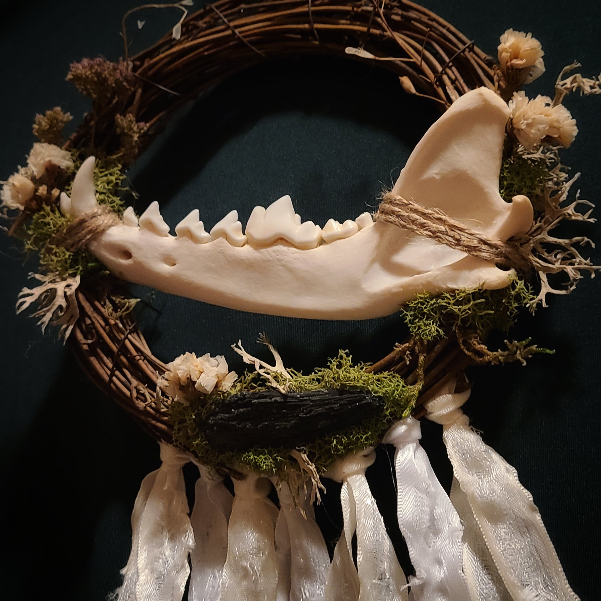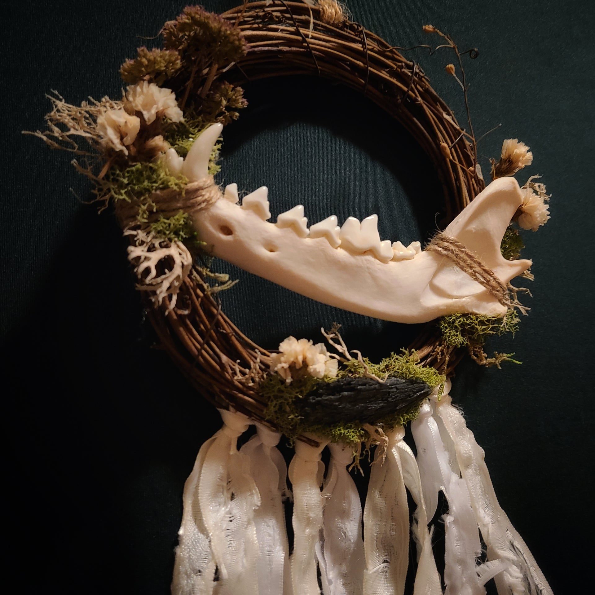 Add an eerie touch to your home decor with this handmade coyote jaw oddity wreath. Featuring hand-distressed cream and white silk ribbon and a black kyanite specimen. Surrounded moss, lichen, and dried botanicals creating a naturally mystical look.