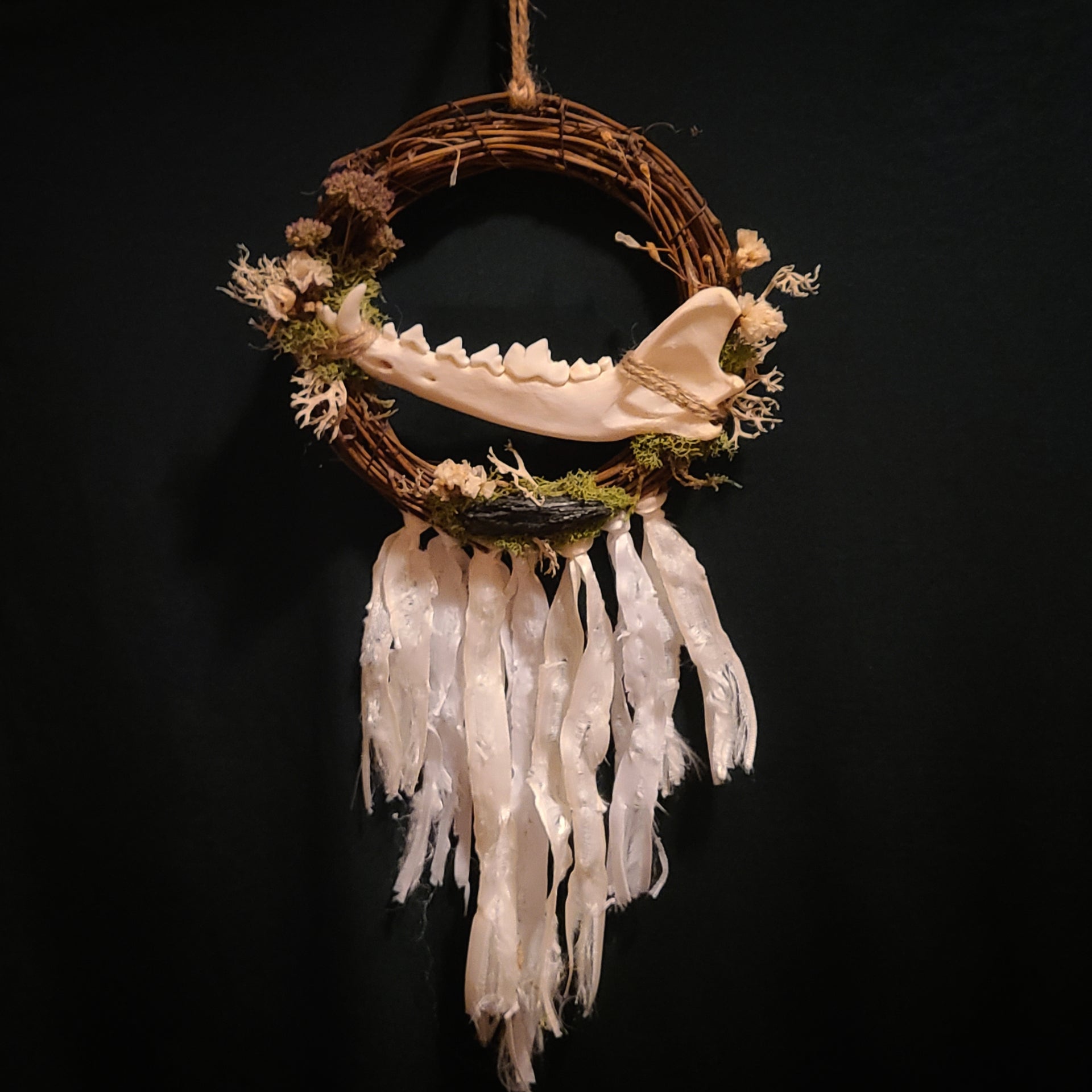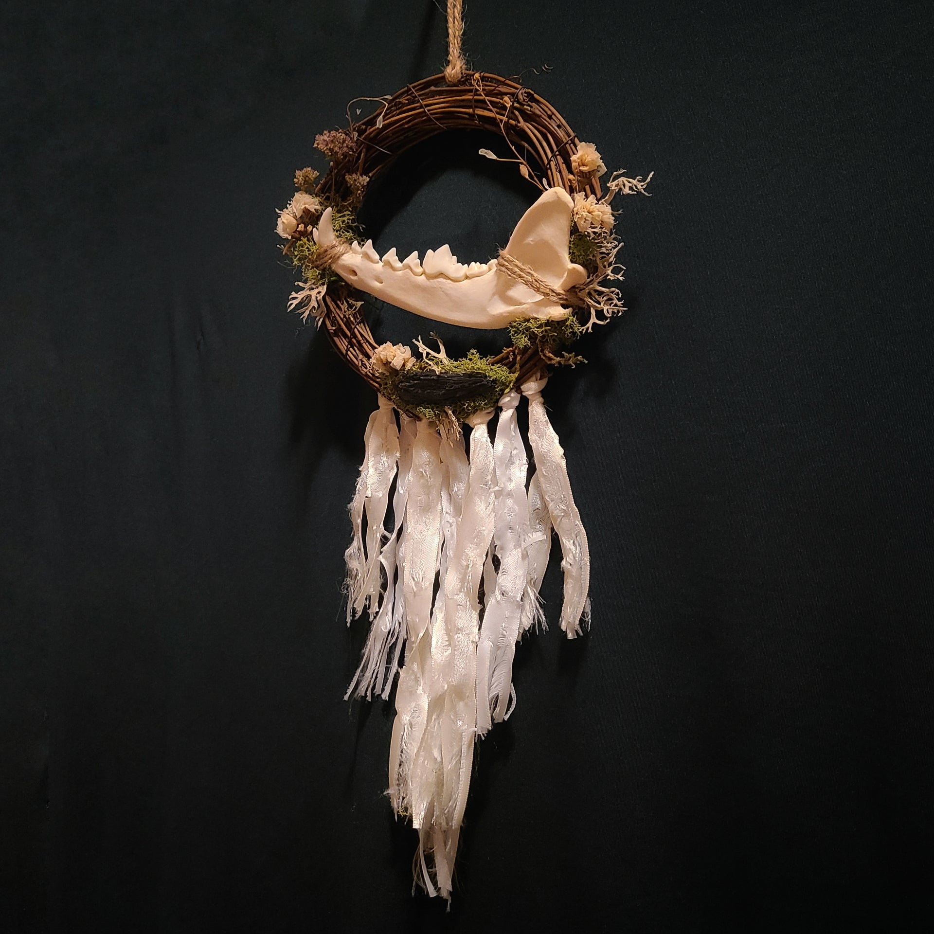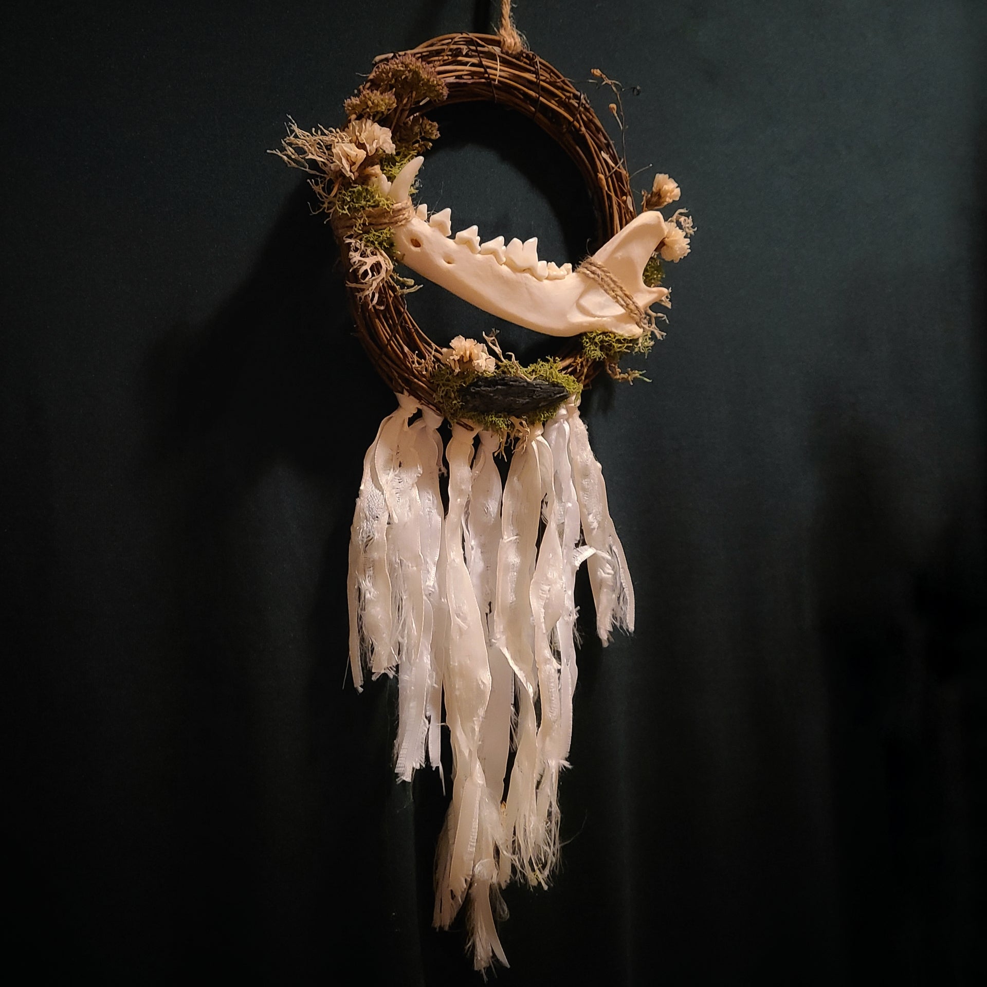 Add an eerie touch to your home decor with this handmade coyote jaw oddity wreath. Featuring hand-distressed cream and white silk ribbon and a black kyanite specimen. Surrounded moss, lichen, and dried botanicals creating a naturally mystical look.