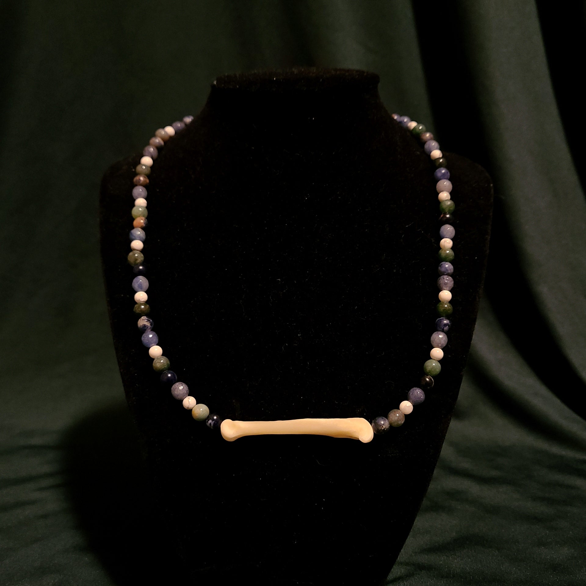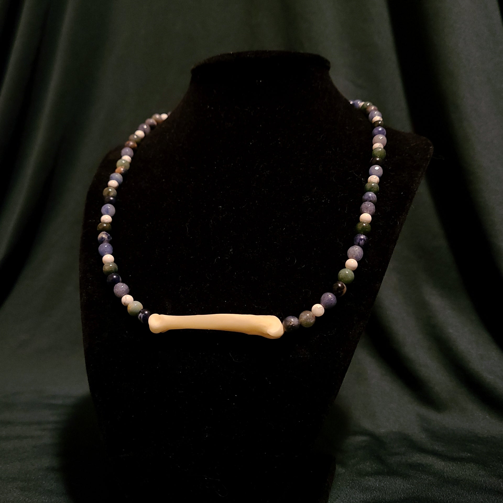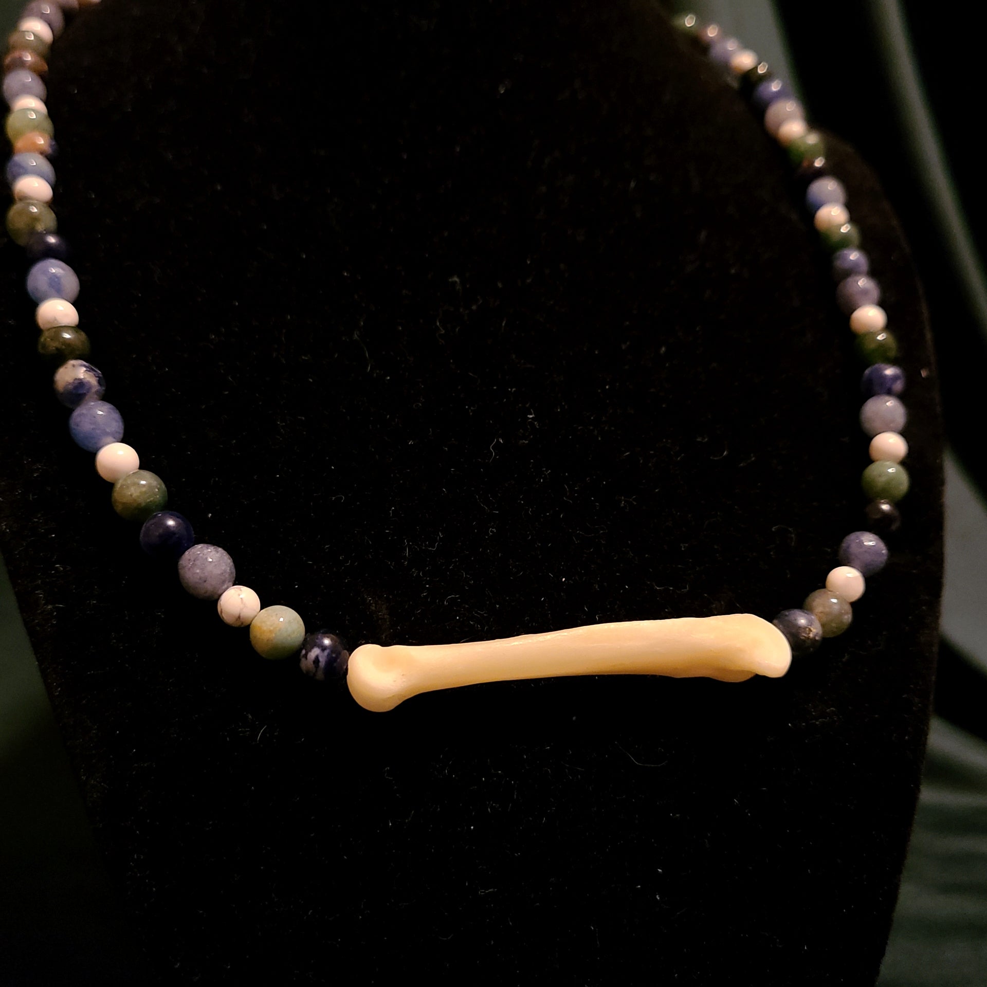 Handmade beaded necklace with coyote metacarpal bone. Featuring howlite, sodalite, blue aventurine, and fancy jasper. 17 inches long with 2 inch extender (19 inches total) Lobster clasp and silver findings.