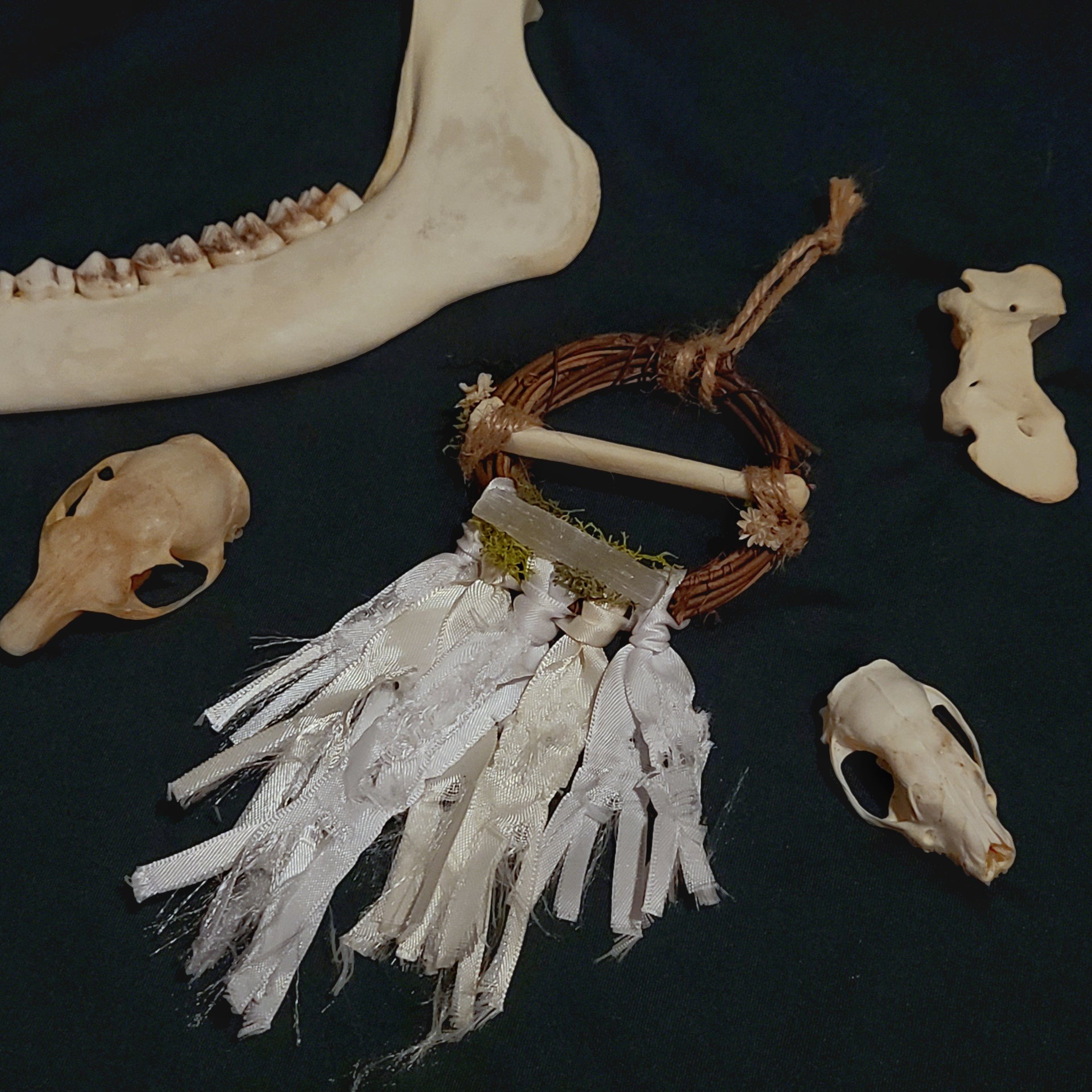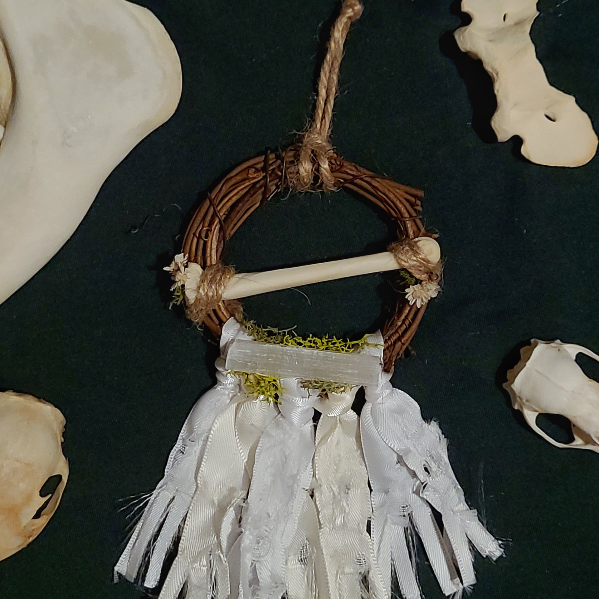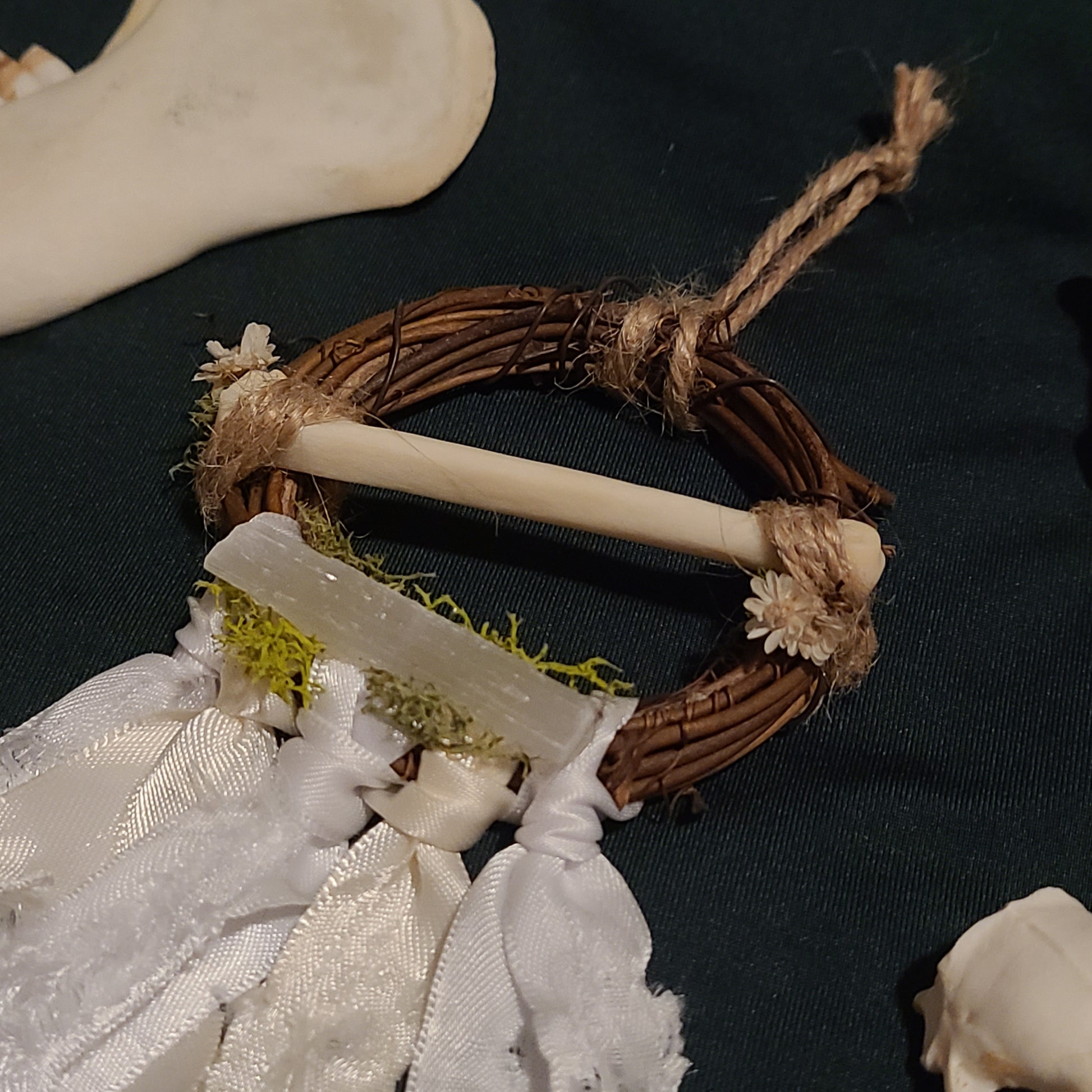 Handmade coyote toe bone mini wreath with hand selected selenite piece. Includes moss and dried flowers. Features hand distressed white and cream silk ribbon. Double secured with glue and twine. Comes with loop of twine at top for wall or hanging display.