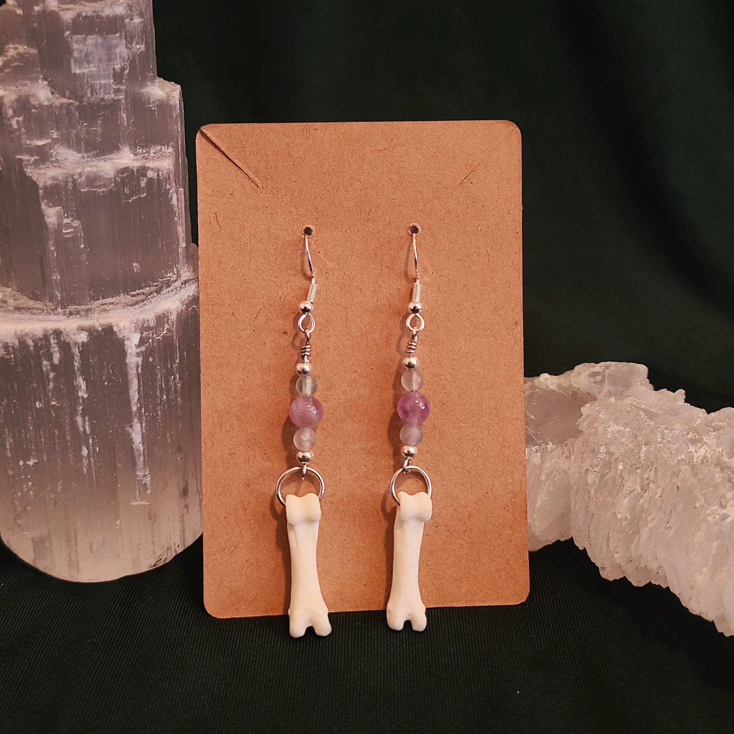 Coyote toe dangle earrings with blue and purple fluorite stone beads. Silver accents. Hypoallergenic hook earrings with silicone stops.