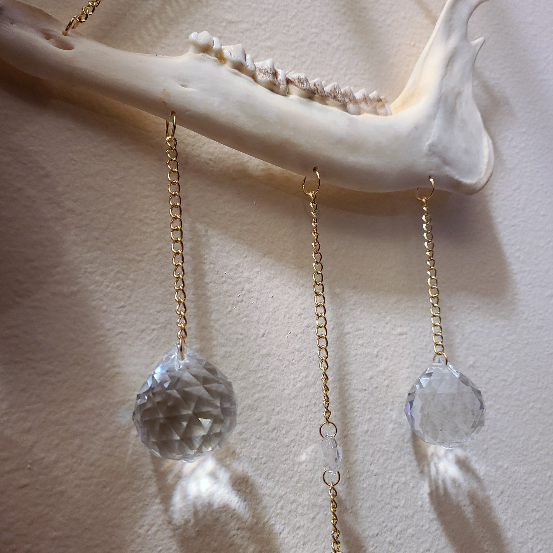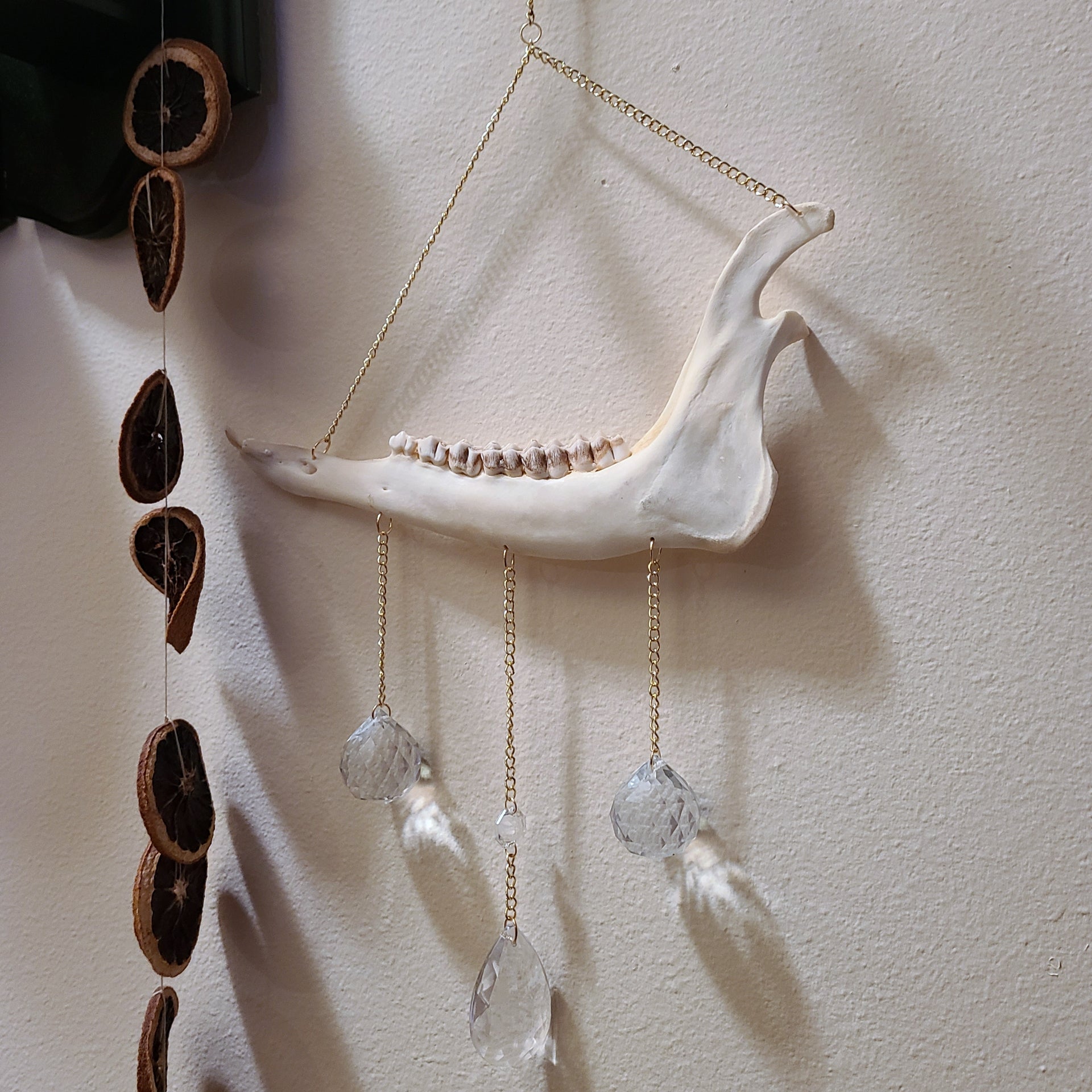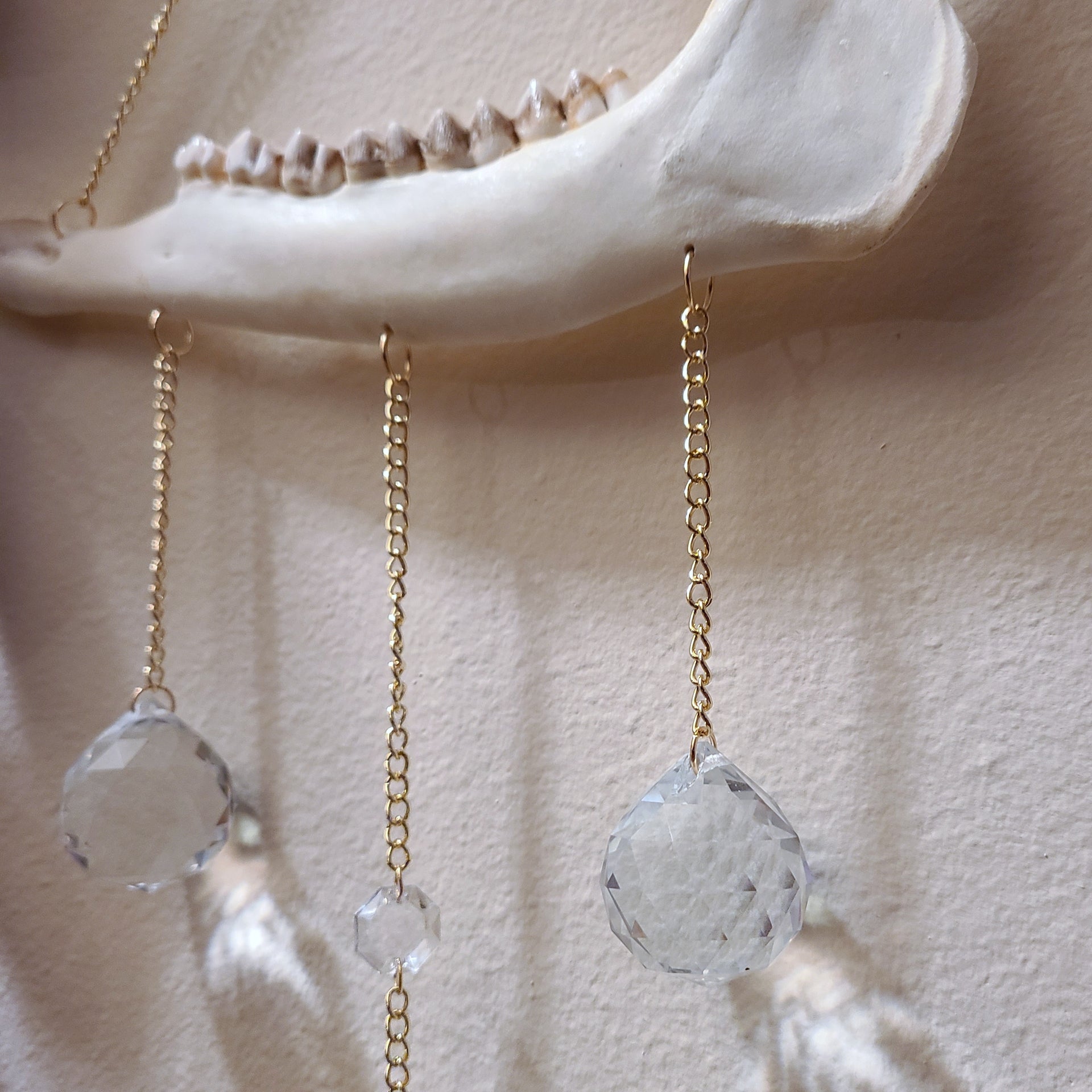 Handmade oddity deer jaw suncatcher. Featuring gold tone chain, antique chandelier crystals, and suncatching orbs.
