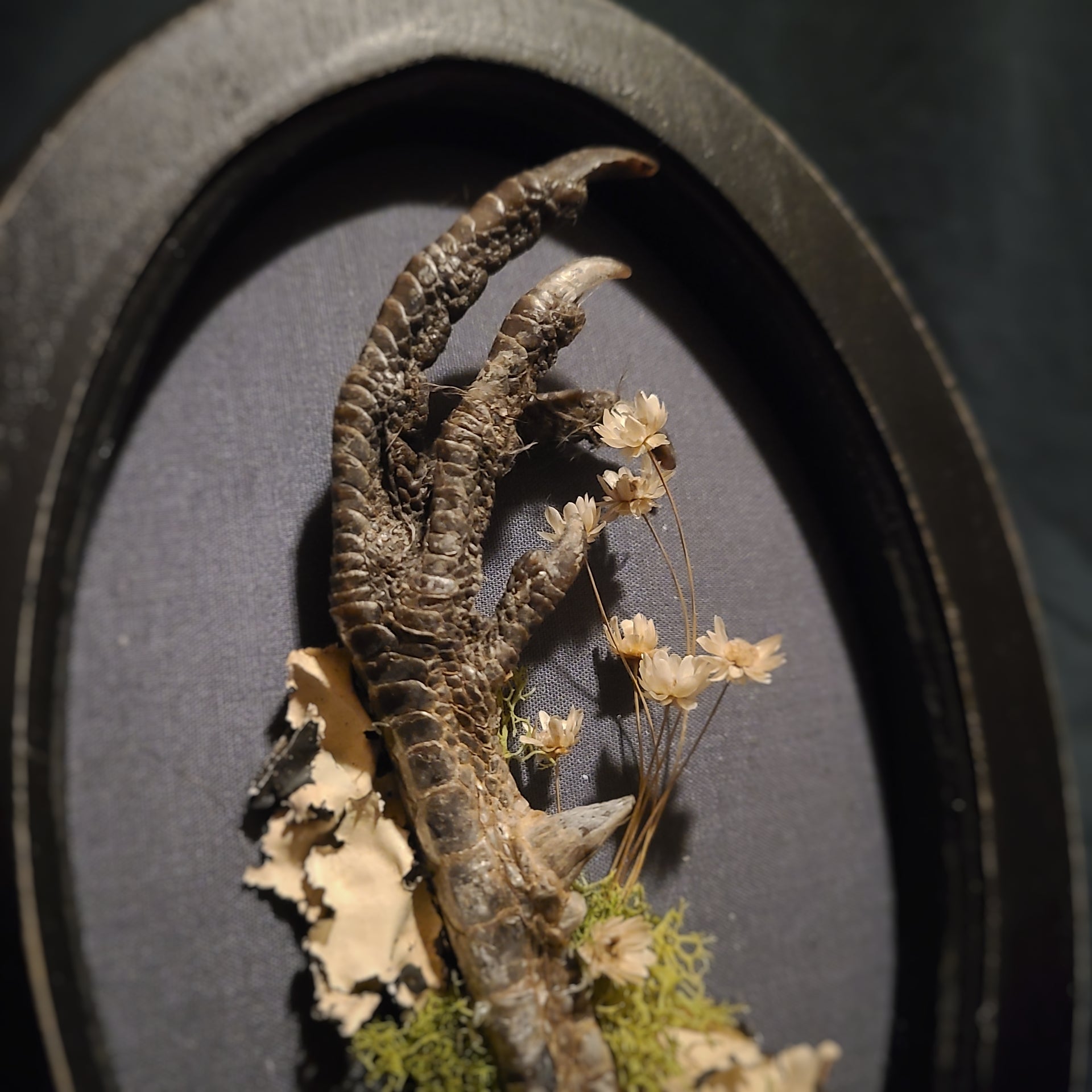 Handmade oddity art featuring preserved pheasant foot surrounded by moss, lichen, and dried flowers. On a ~7 in x ~5 in dark wood oval frame with grey fabric backing. Can be displayed on wall or propped on flat surface.