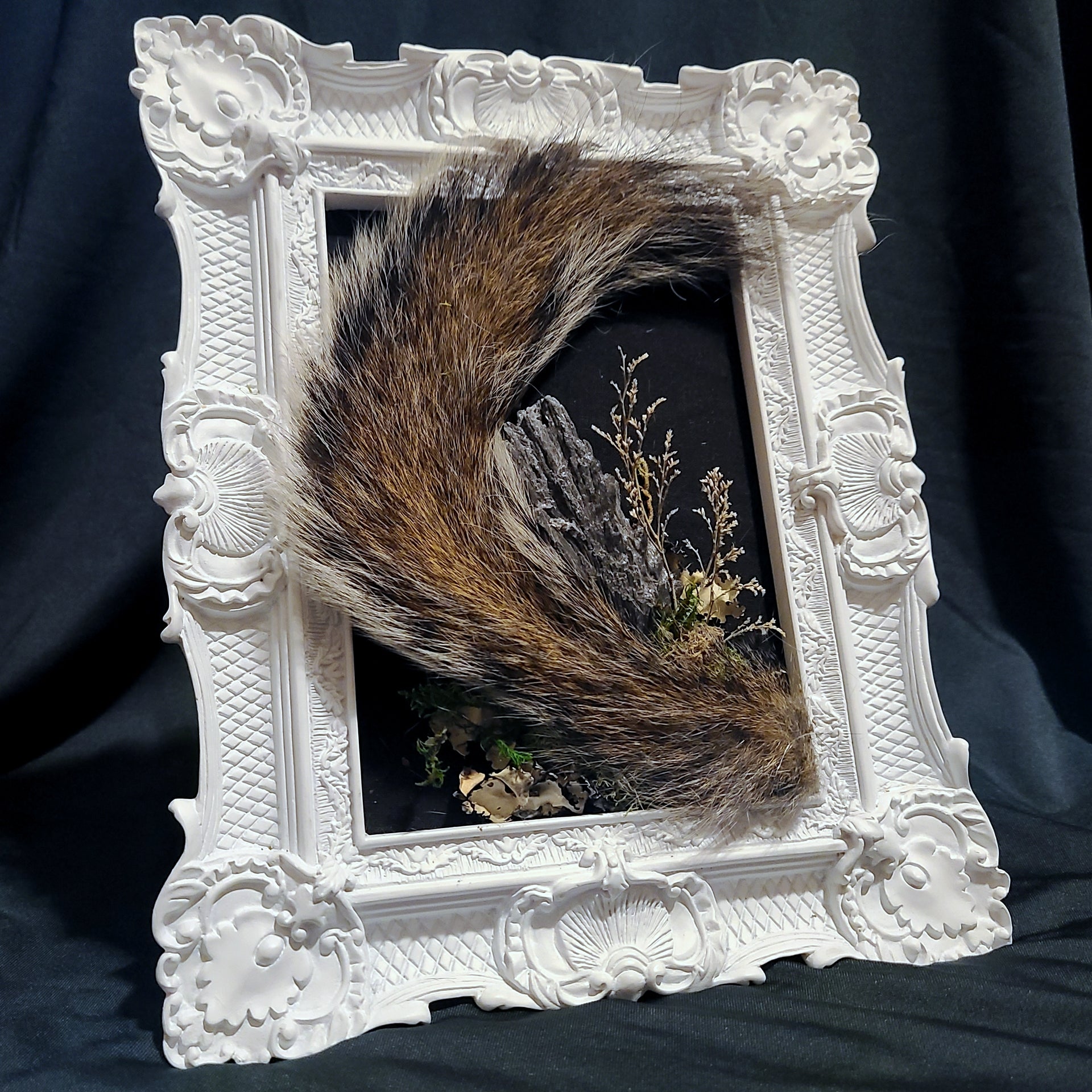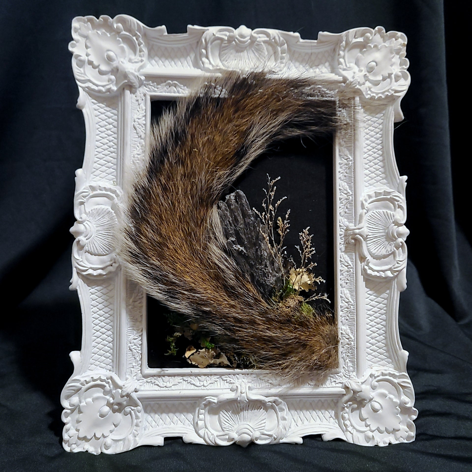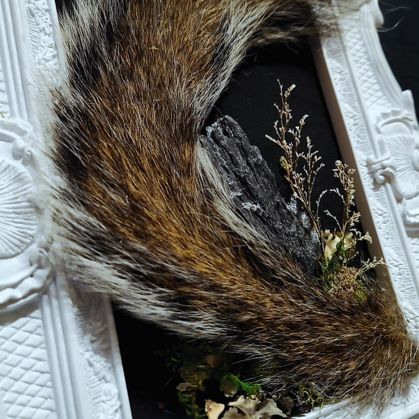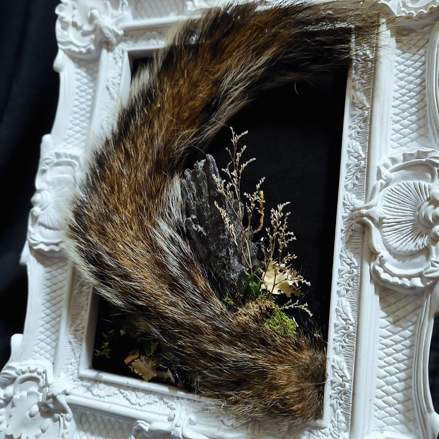 "Forest Floor" - handmade oddity art featuring a preserved squirrel tail. Surrounded by moss, lichen, flowers, and a black kyanite fan. Can be hung on a wall or propped on flat surface.