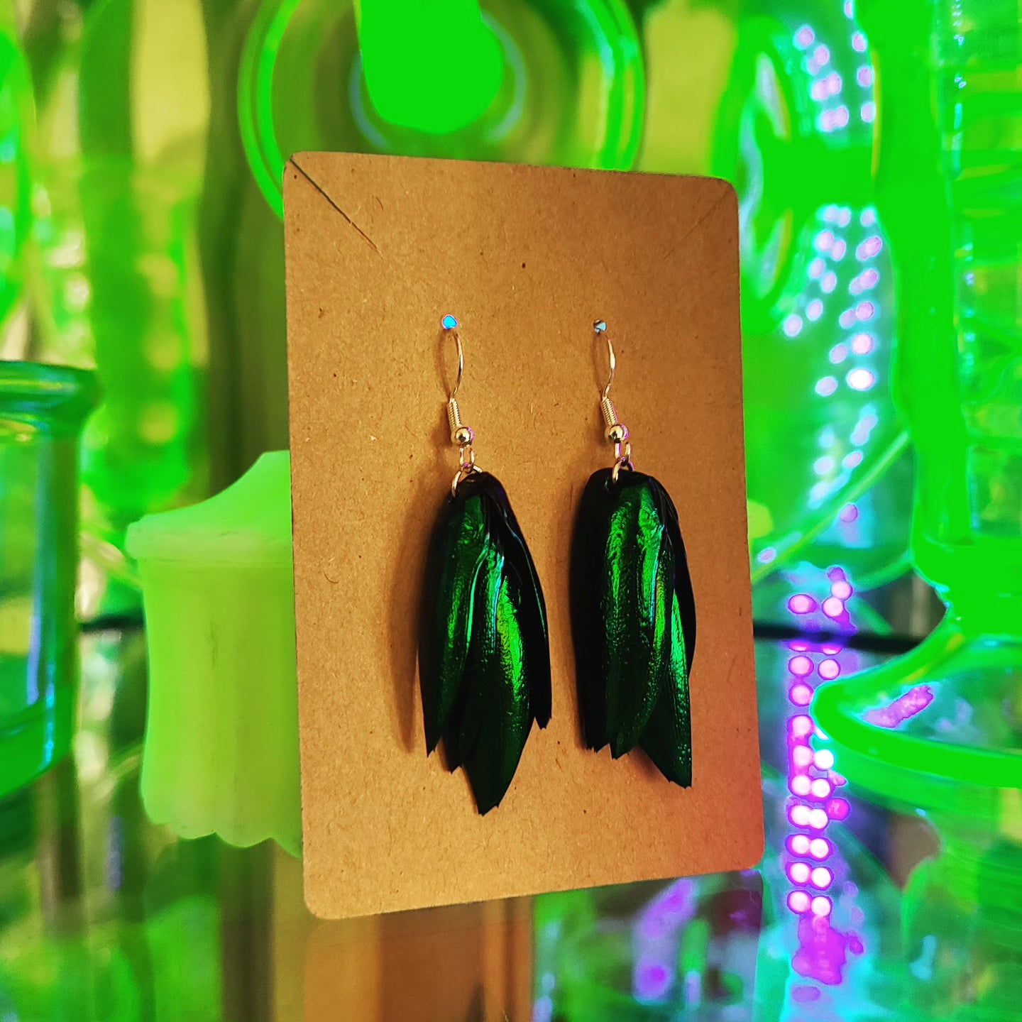 Handmade stacked jewel beetle wing dangle earrings. Hypoallergenic silver hook earrings with silicone stops.