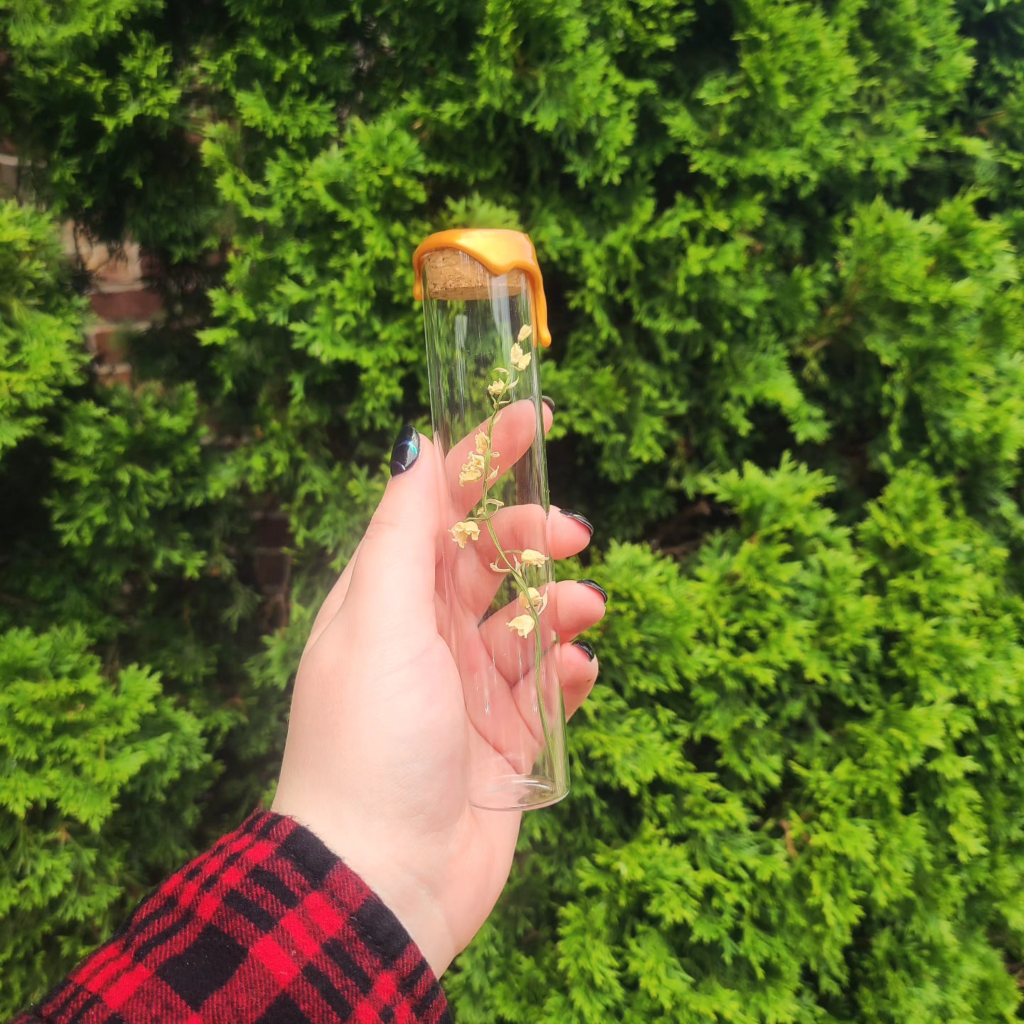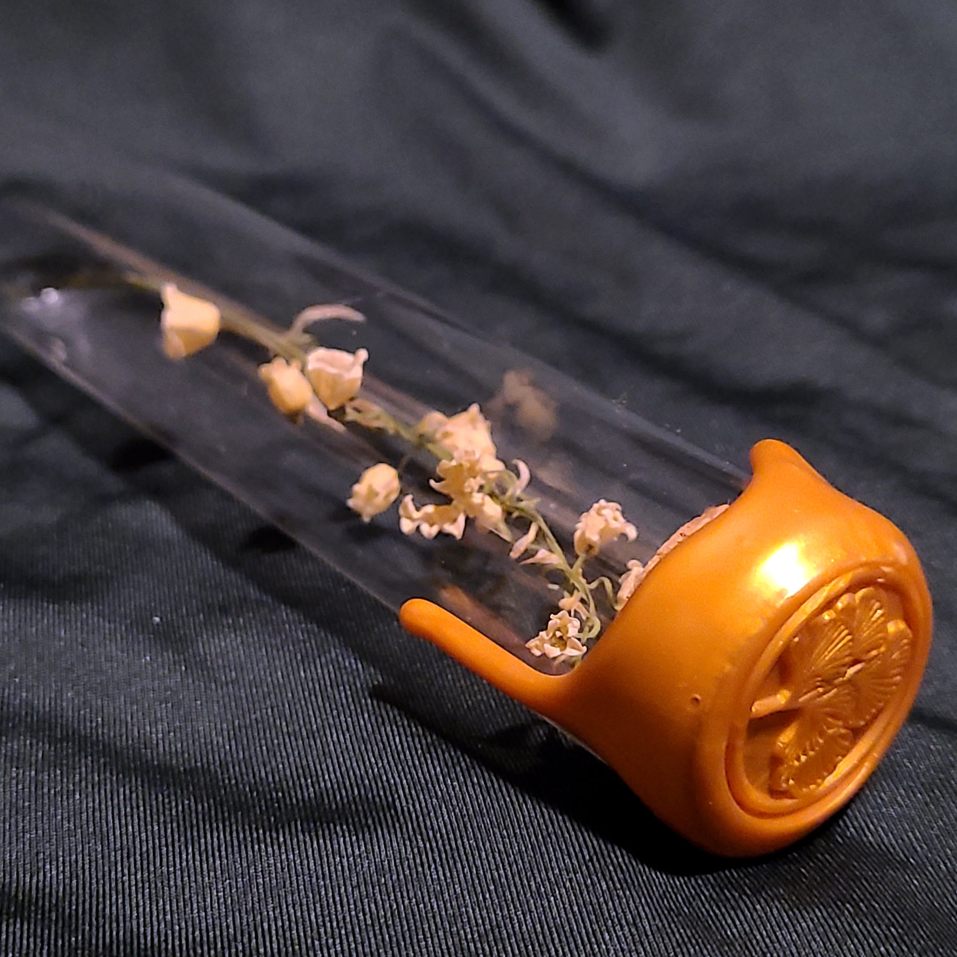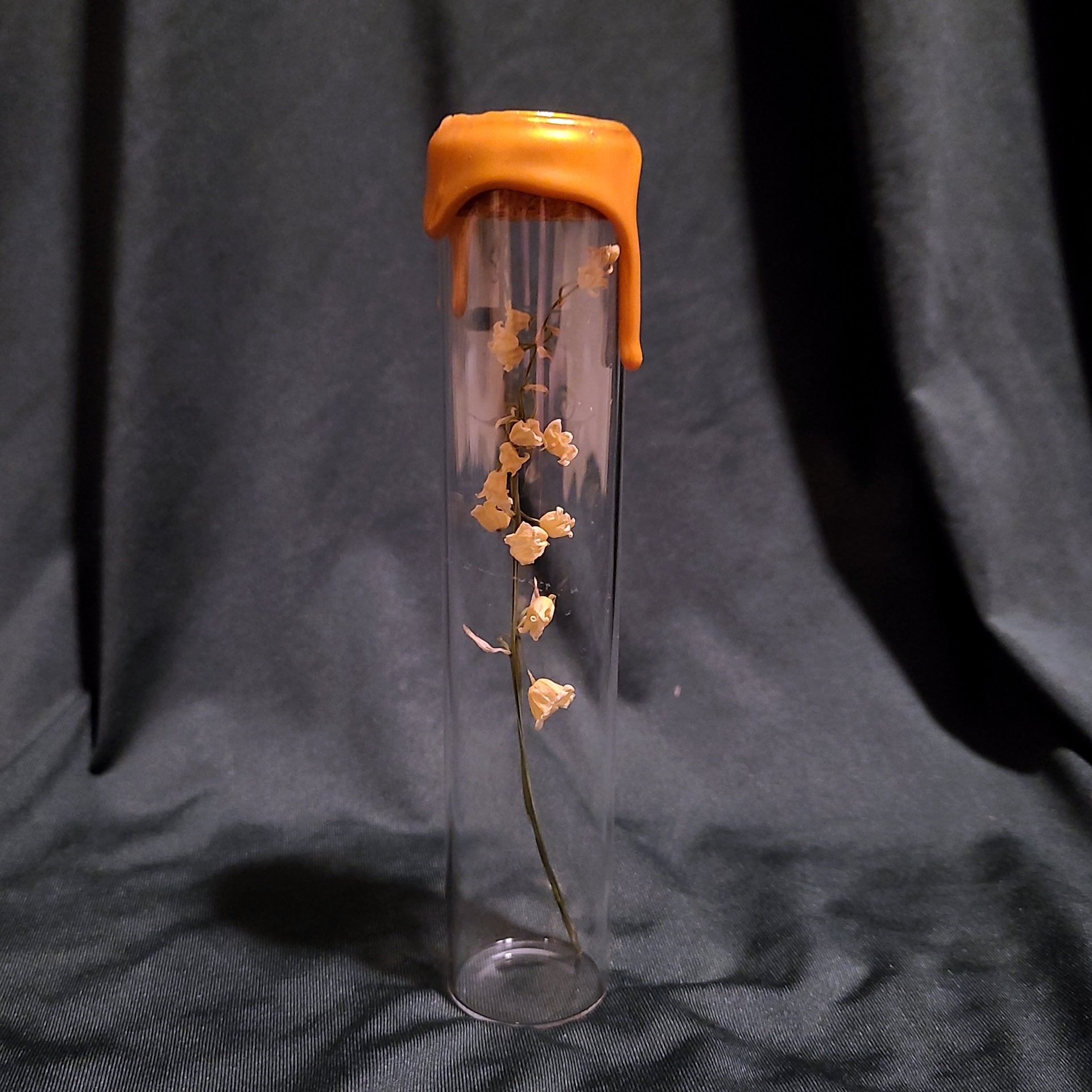 The perfect edition to any natural oddities collection, the exclusive jumbo lily of the valley dried flower glass vial specimen. These blooms were picked, dried, and preserved in May of 2025. Each vial is topped with hand-poured gold wax and sealed with a ginko leaf stamp. Vial is approximately 6 inches tall and 1.2 inches in diameter. Last 2 images are the jumbo specimen vial compared to the regular specimen vial