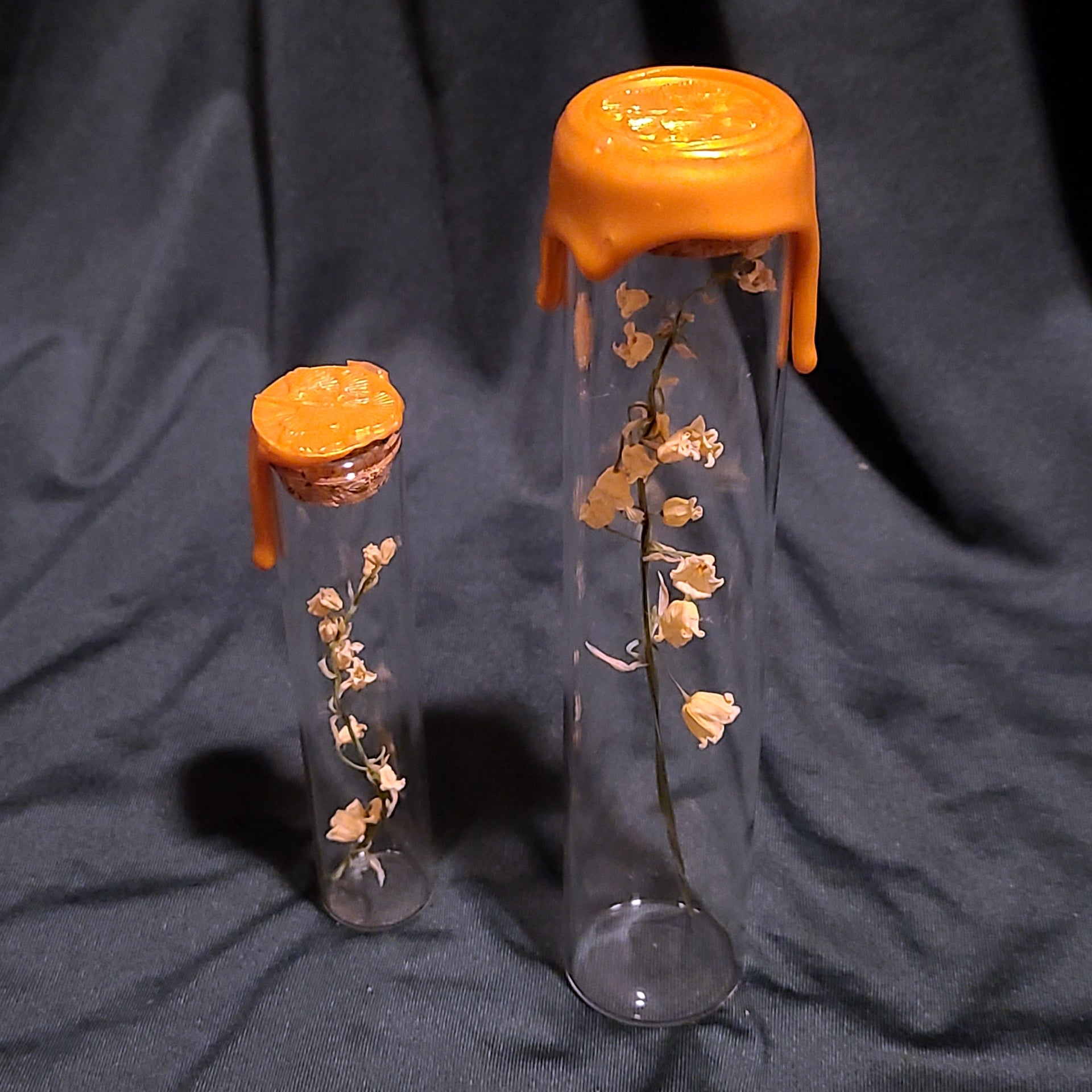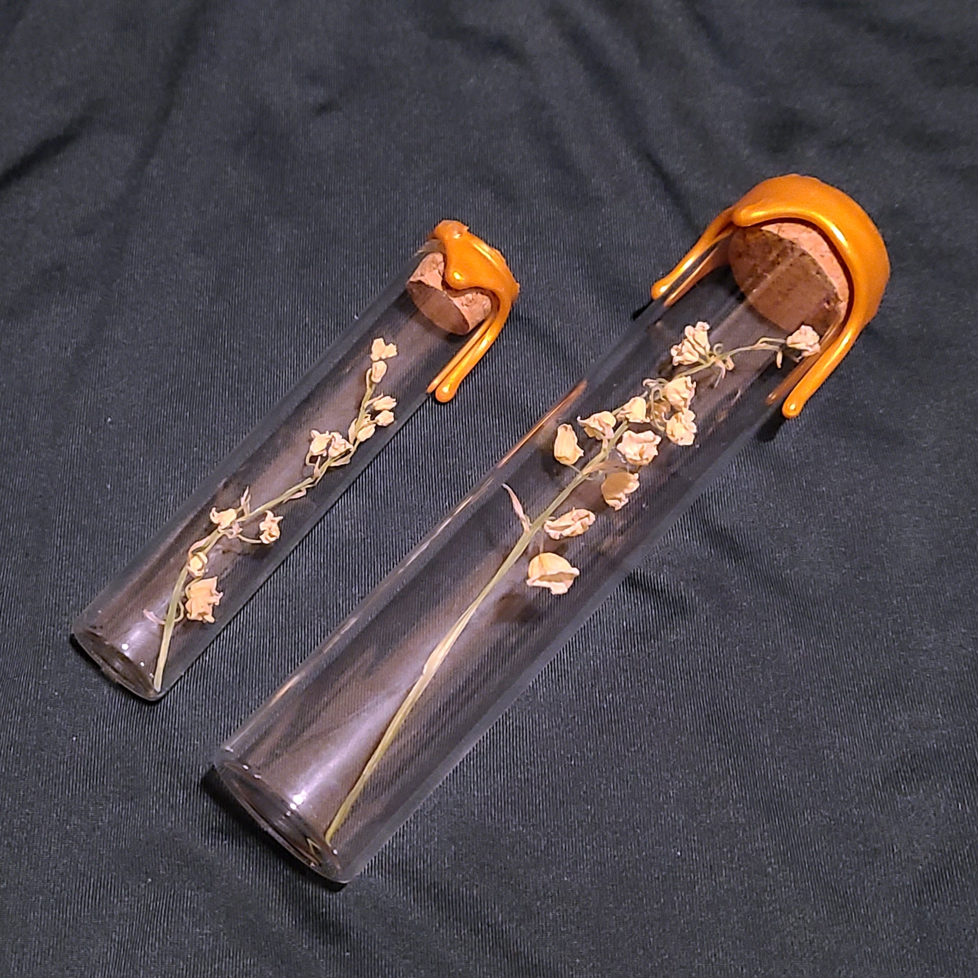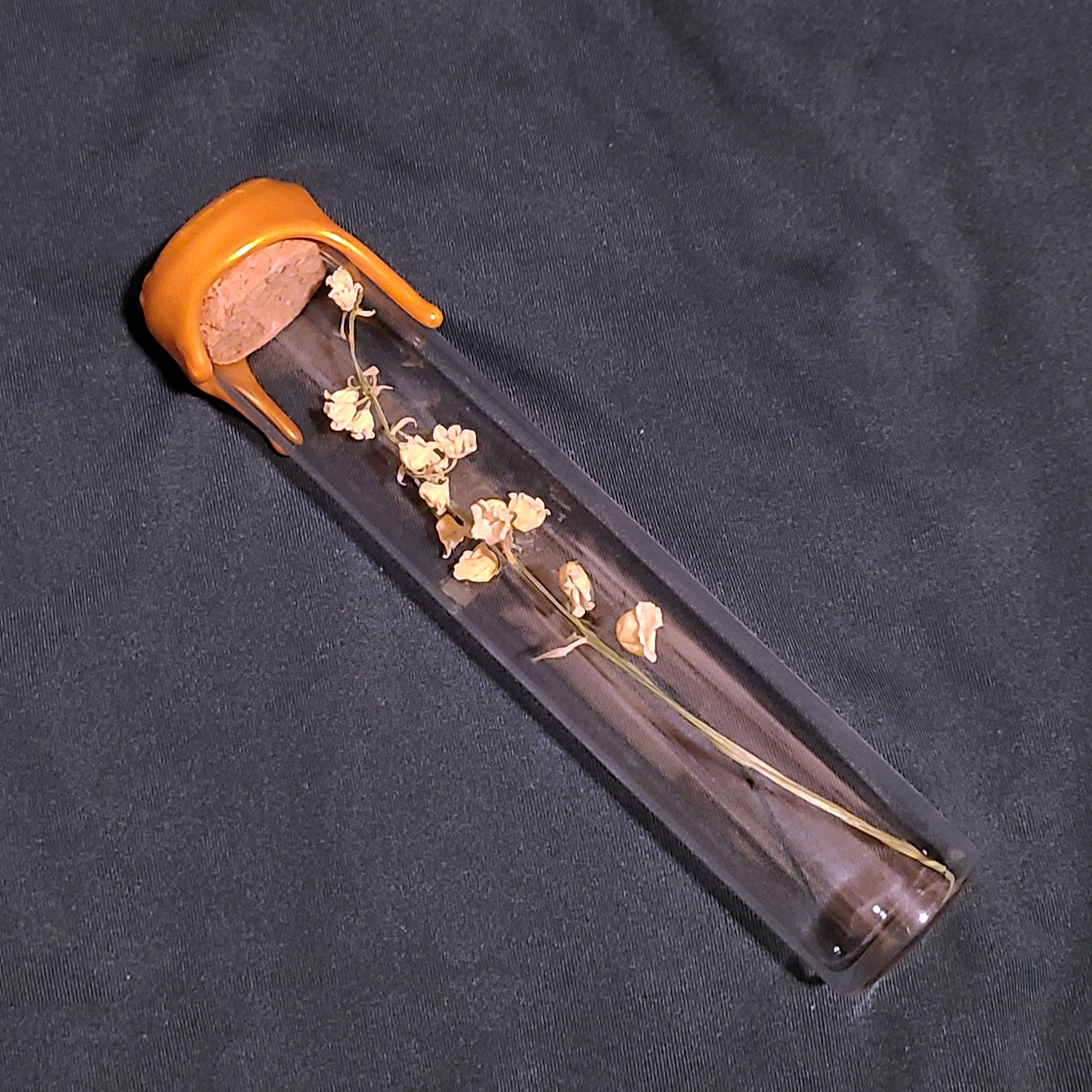 The perfect edition to any natural oddities collection, the exclusive jumbo lily of the valley dried flower glass vial specimen. These blooms were picked, dried, and preserved in May of 2025. Each vial is topped with hand-poured gold wax and sealed with a ginko leaf stamp. Vial is approximately 6 inches tall and 1.2 inches in diameter. Last 2 images are the jumbo specimen vial compared to the regular specimen vial