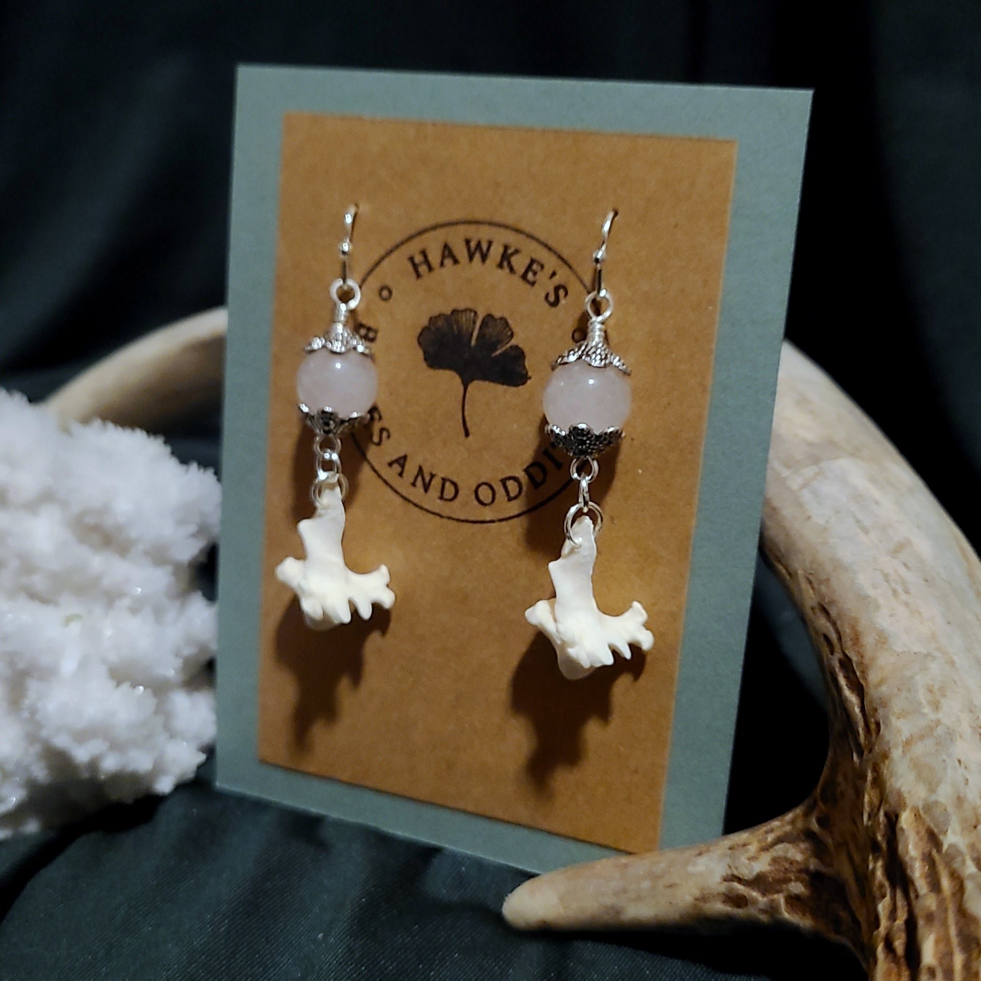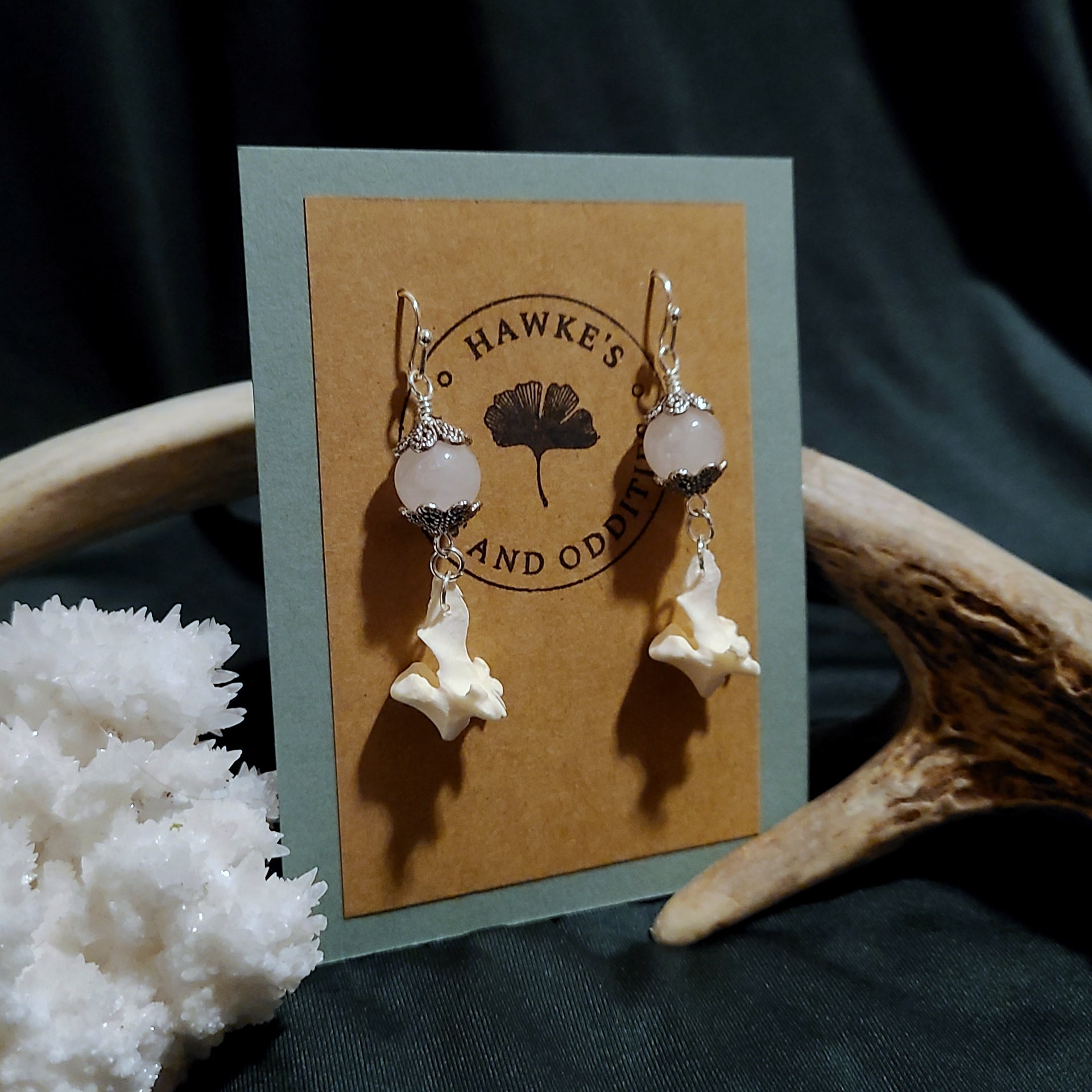 Handmade oddity mink vertebrae dangle earrings with rose quartz and silver tone bead caps. Nickel-free steel silver tone earwires with silicone stops.
