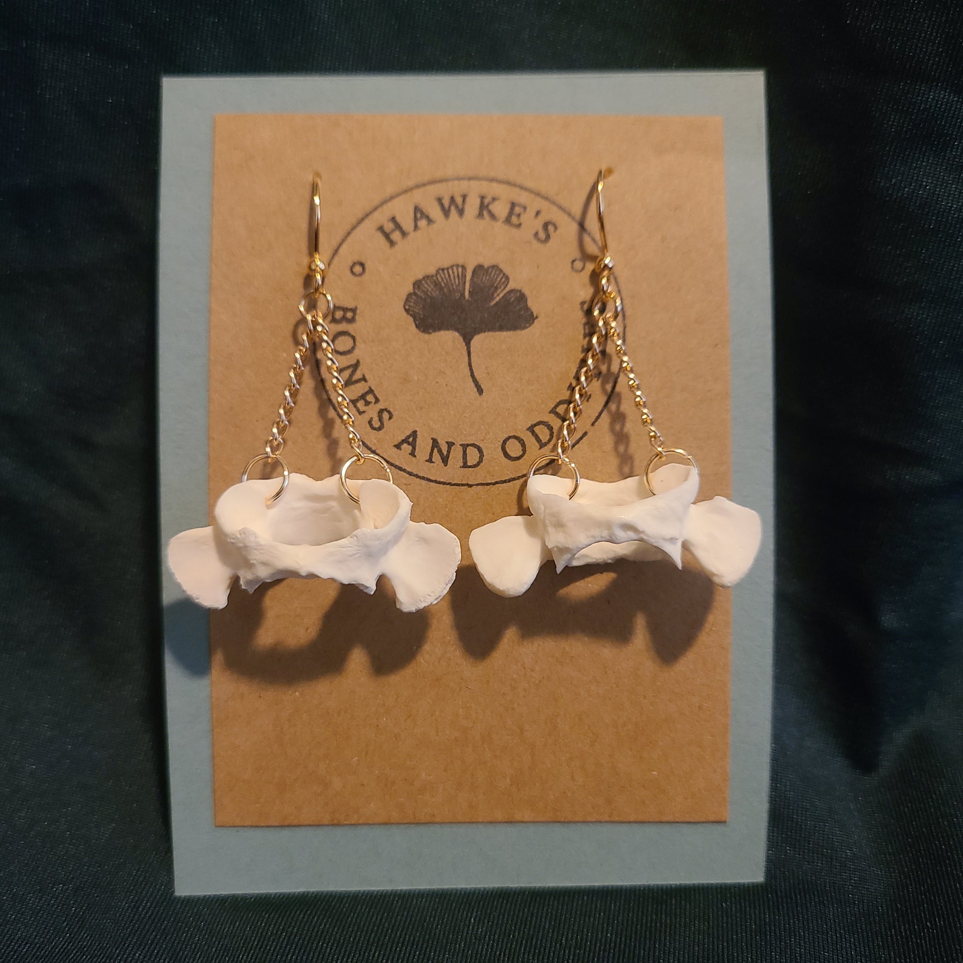 Handmade oddity opossum atlas dangle earrings with gold tone chain. Gold tone nickle-free stainless steel earwires with silicone ear nuts.