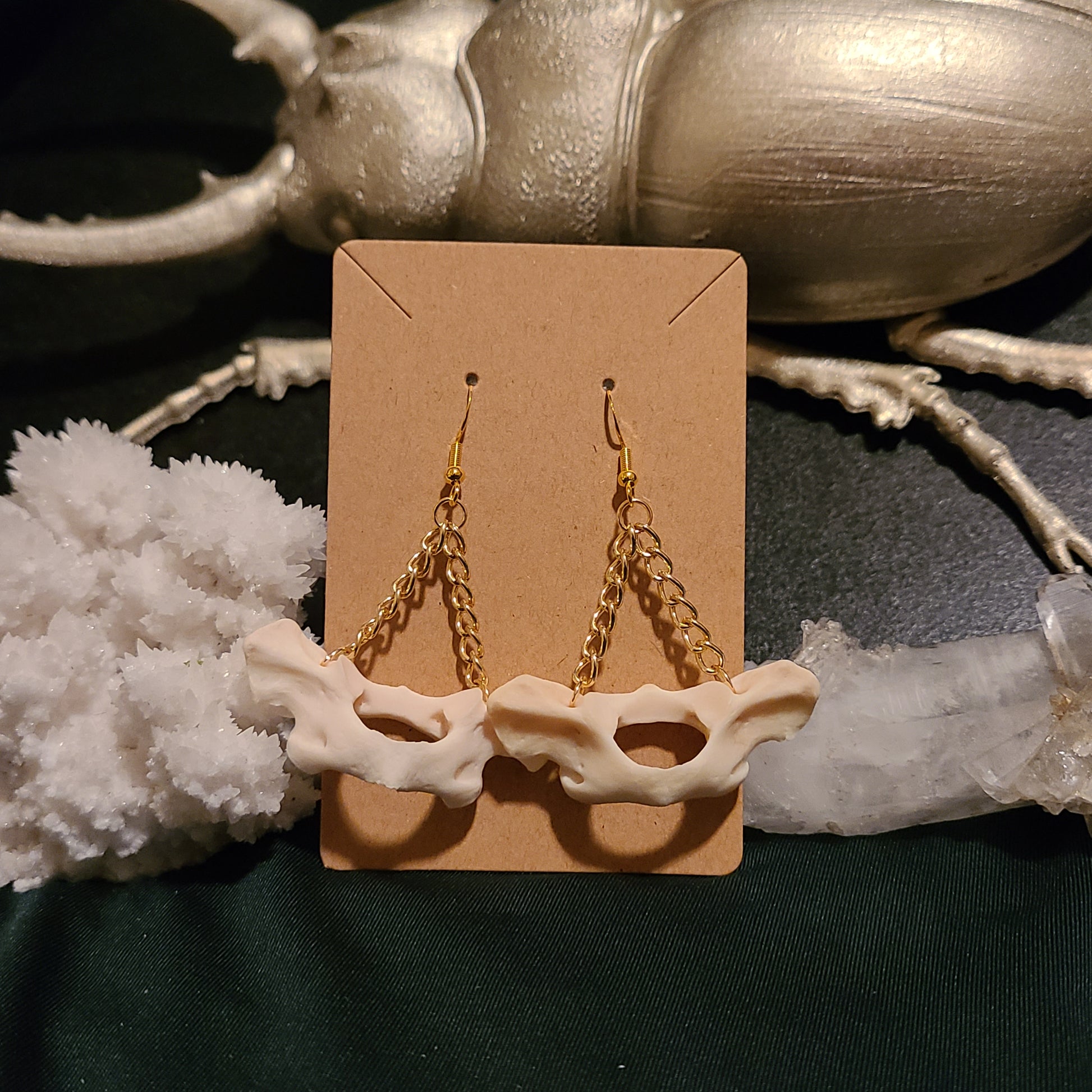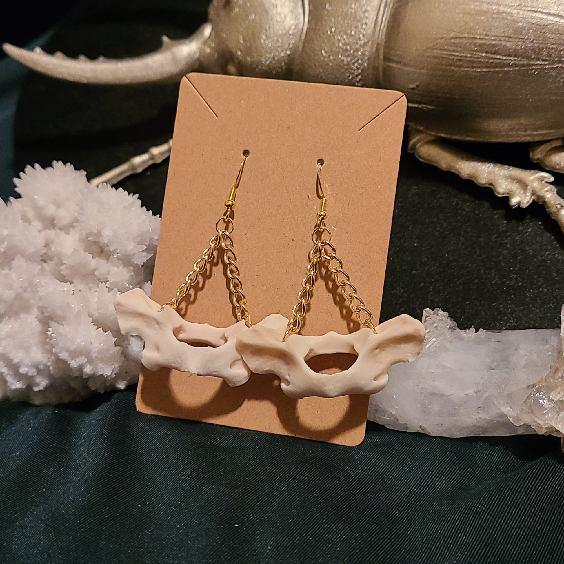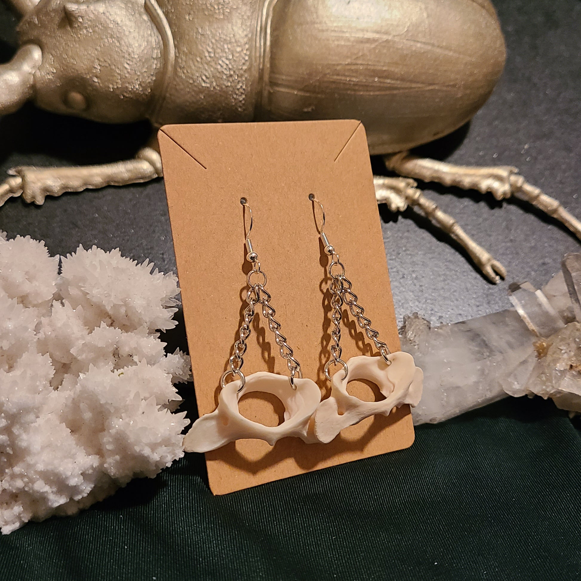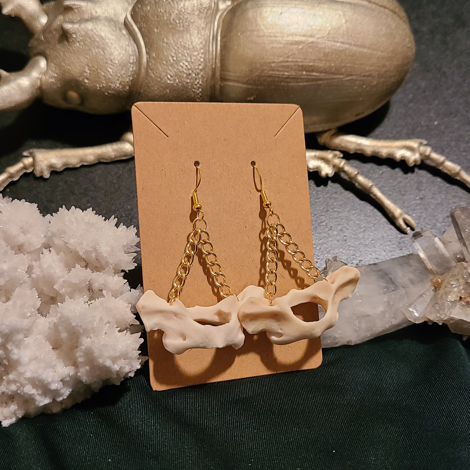 Handmade otter atlas dangle chain earrings. Vertebrae are around 1.5 inches wide and .75 inches long. Bones may vary in size, shape, and color. Available in gold or silver. Hypoallergenic hook earrings with silicone stops.