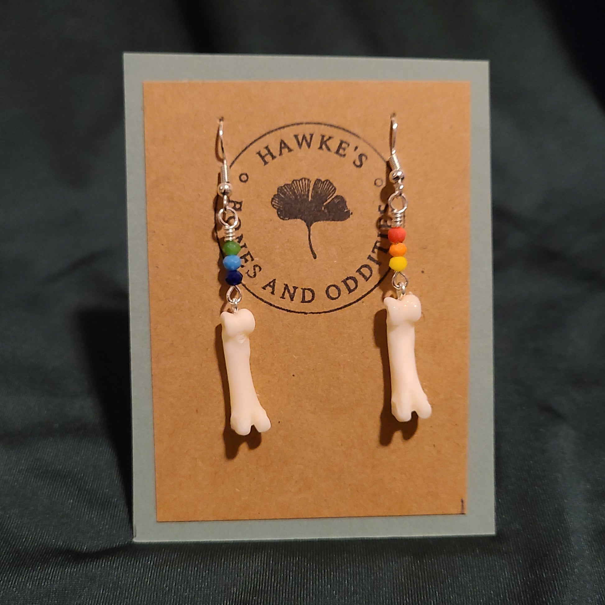 Handmade oddity coyote toe dangle earrings with rainbow design glass beads. Available in silver nickle-free earwires and silicone ear nuts. Earrings are approximately 1.75 - 2 inches long.