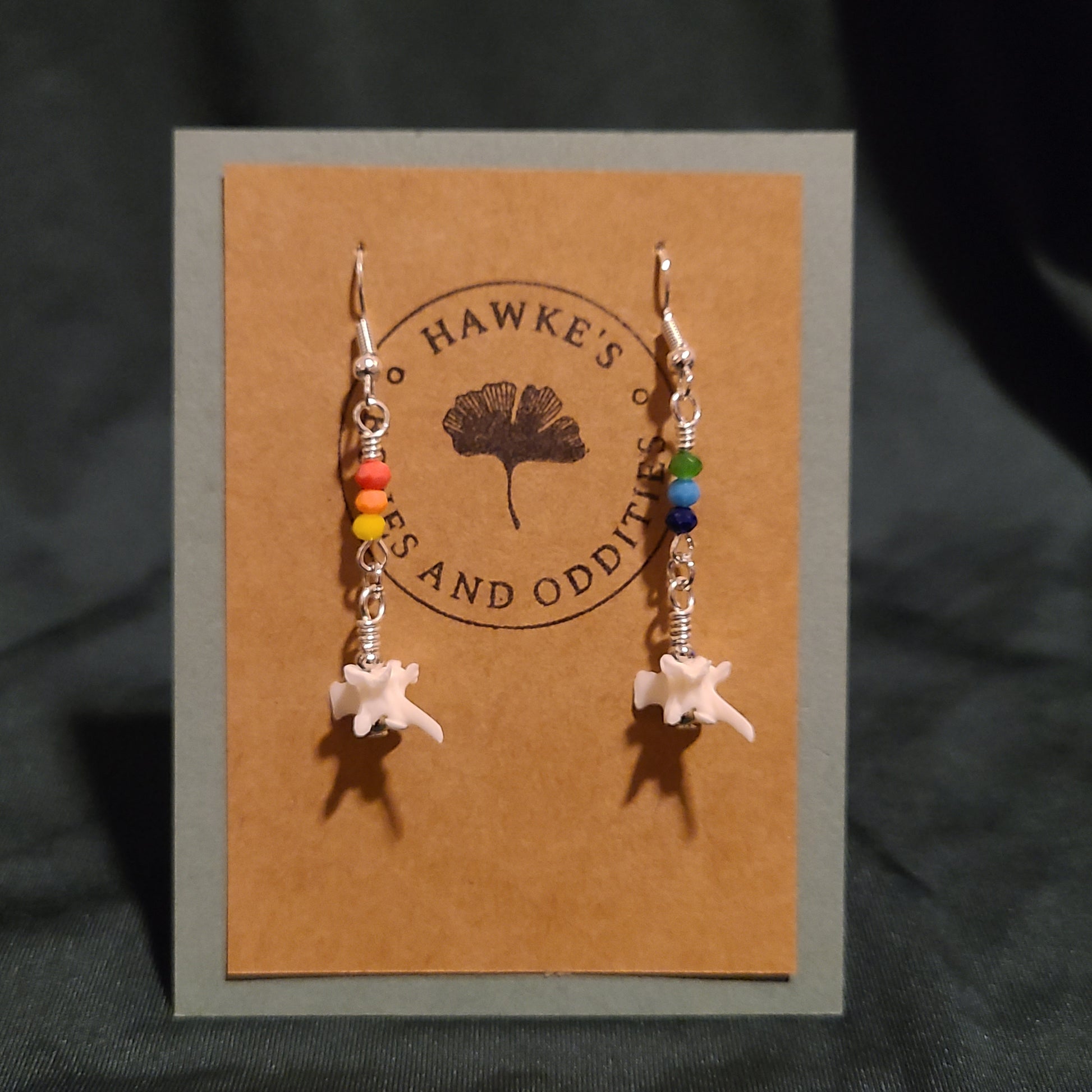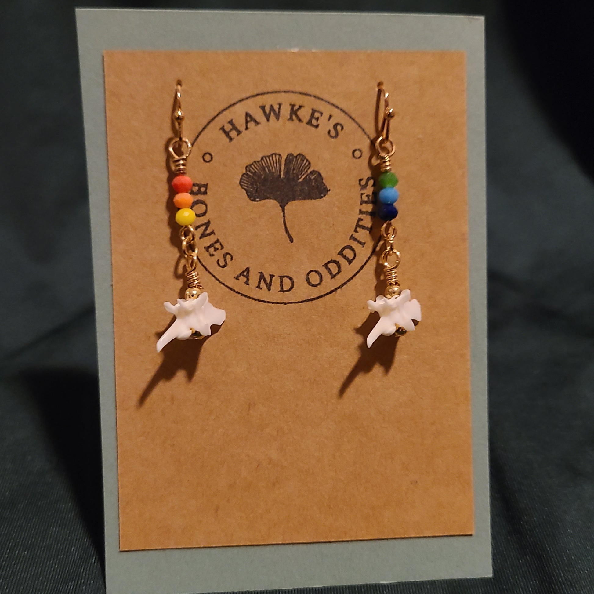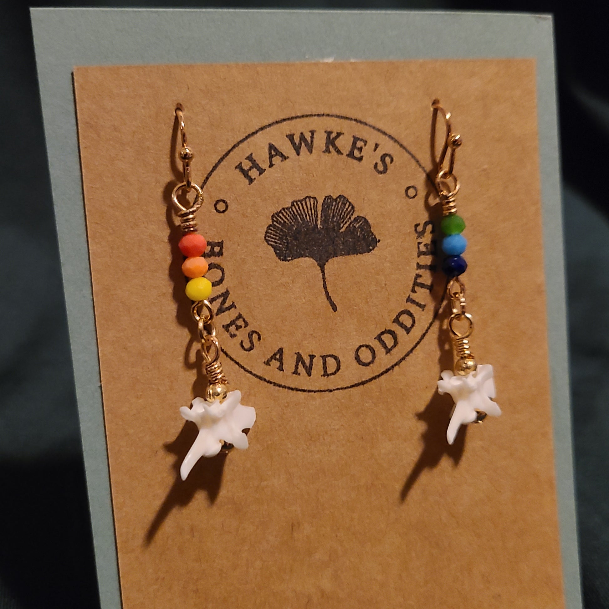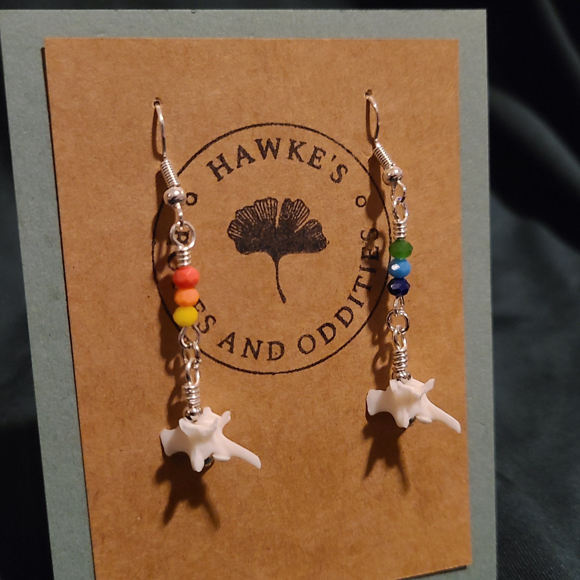 Handmade rattlesnake vertebrae dangle earrings with rainbow glass beads. Available in gold or silver nickle-free earwires with silicone stops. Earrings are approximately 1.5 inches long.