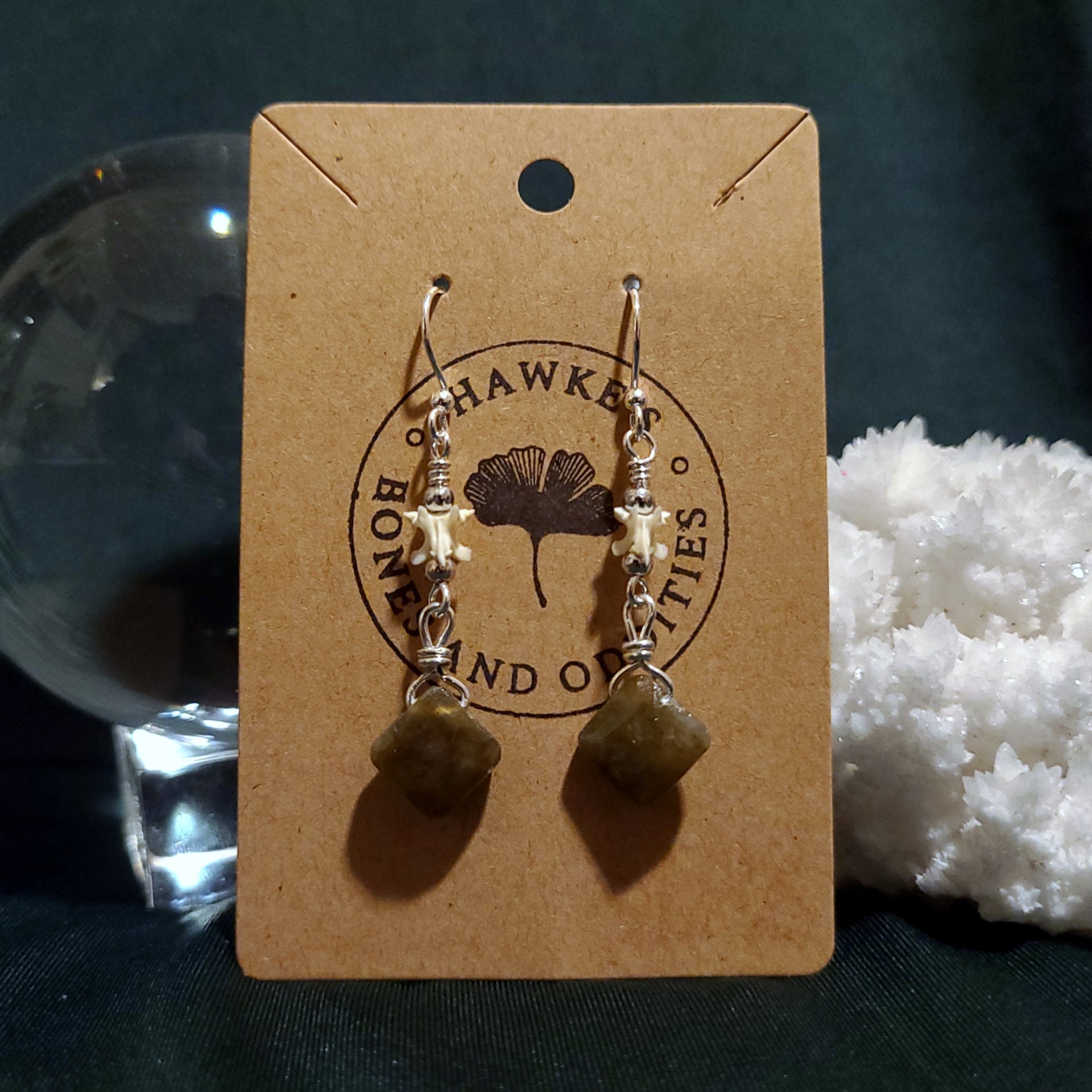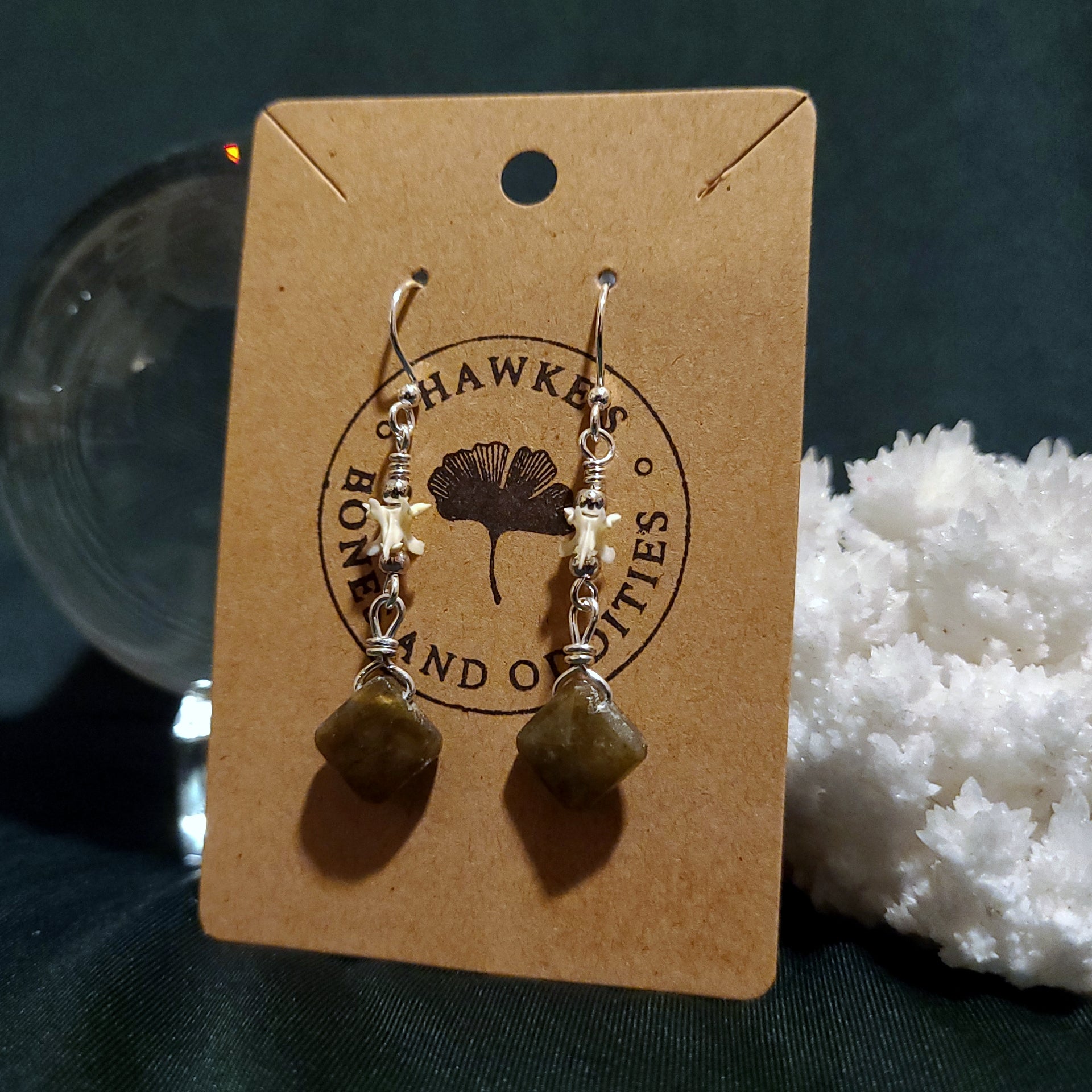 Handmade rattlesnake vertebrae dangle earrings with faceted labradorite kite beads. Silver plated hook earrings with silicone ear nuts.