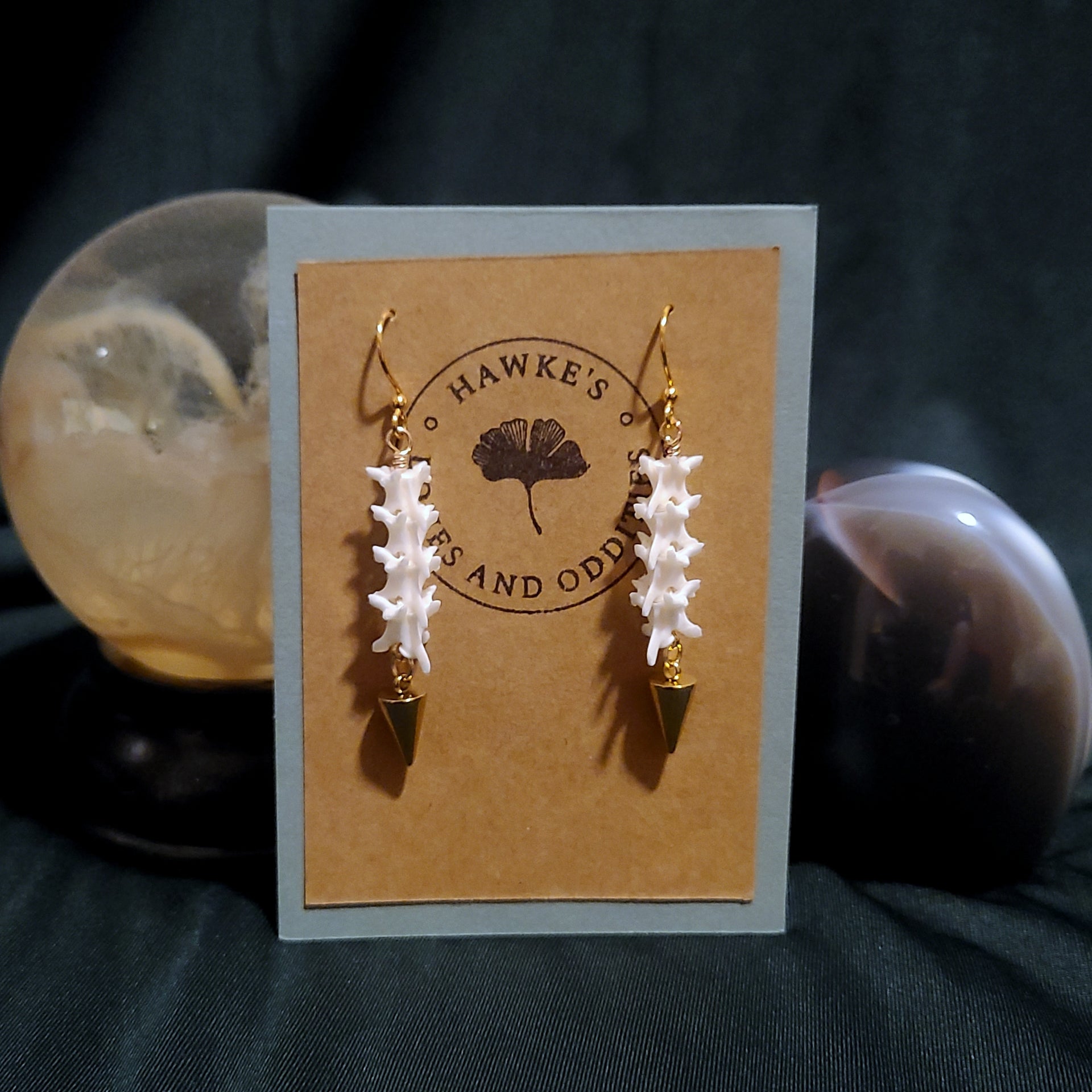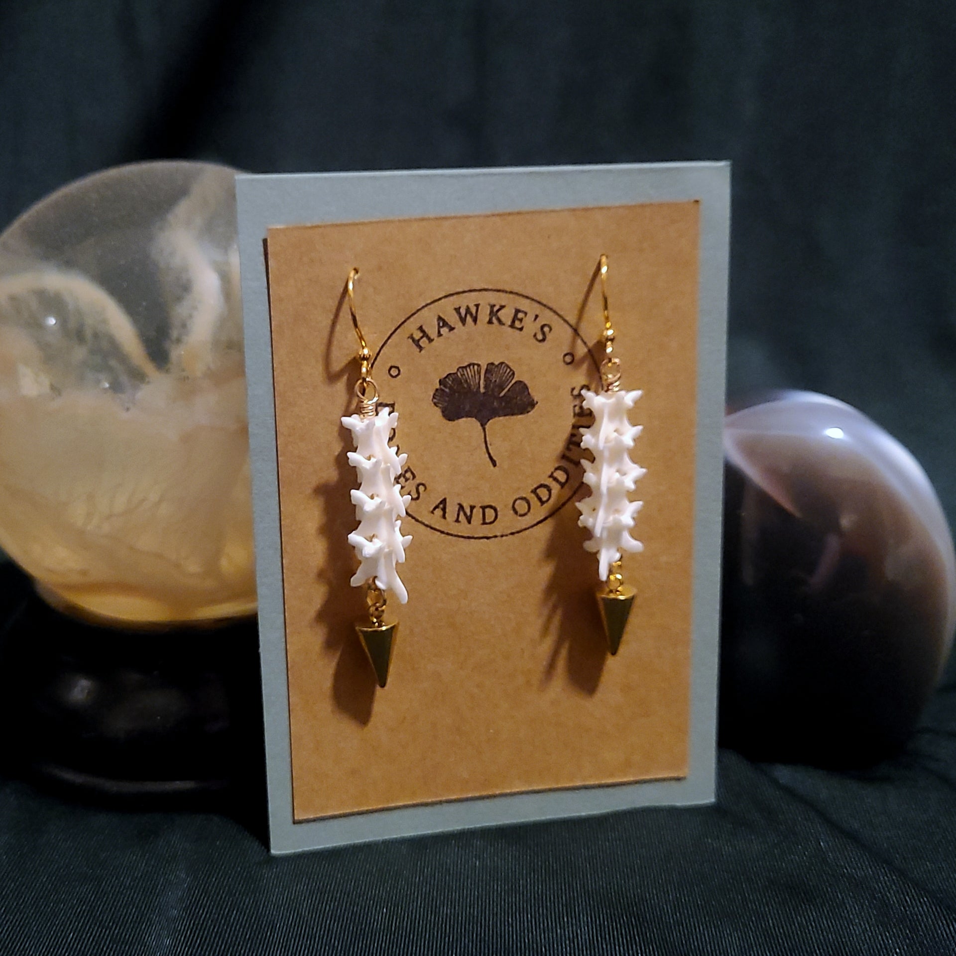 Handmade rattlesnake vertebrae stack dangle earrings with spikes. Available in gold or silver plated nickle-free earwires with silicone earnuts.