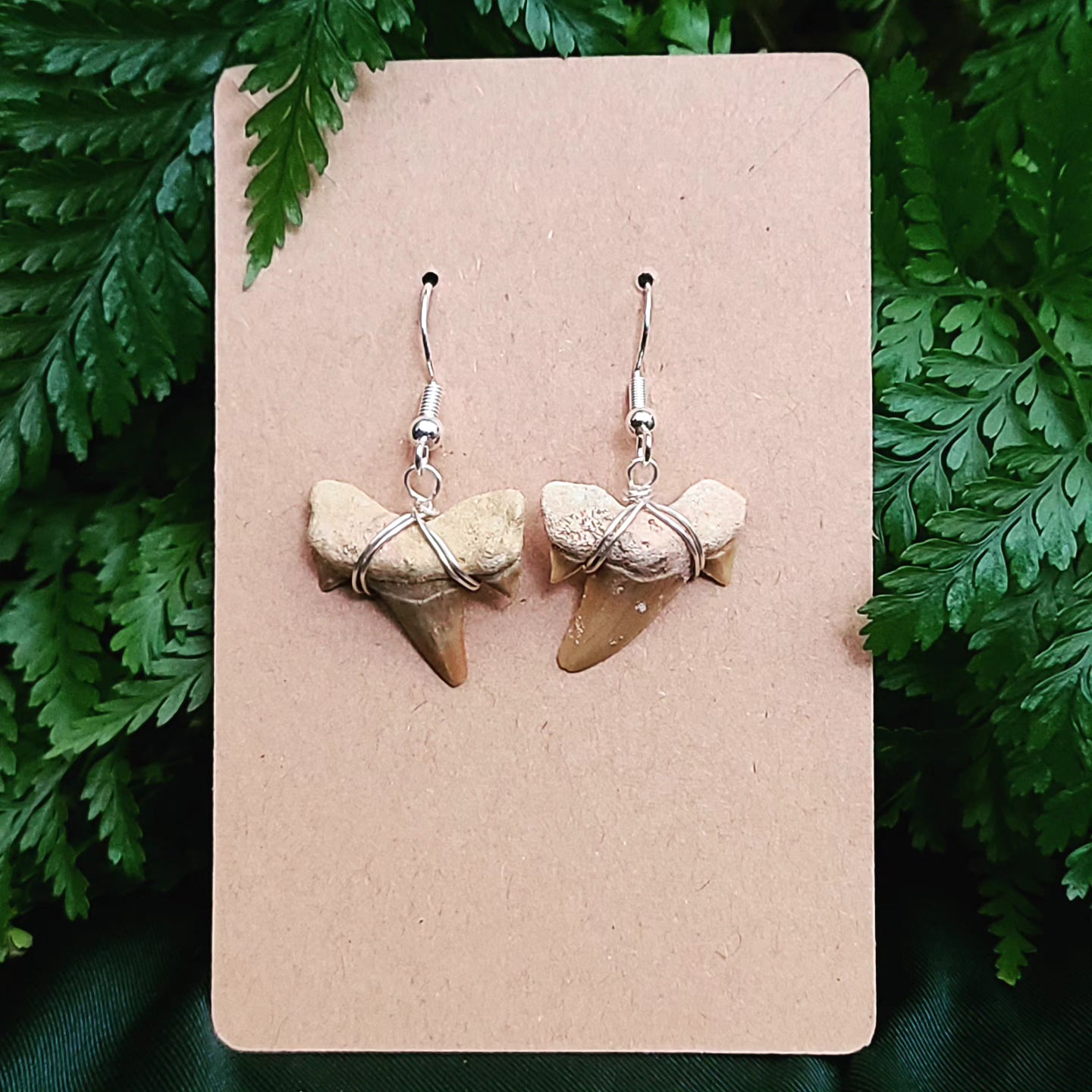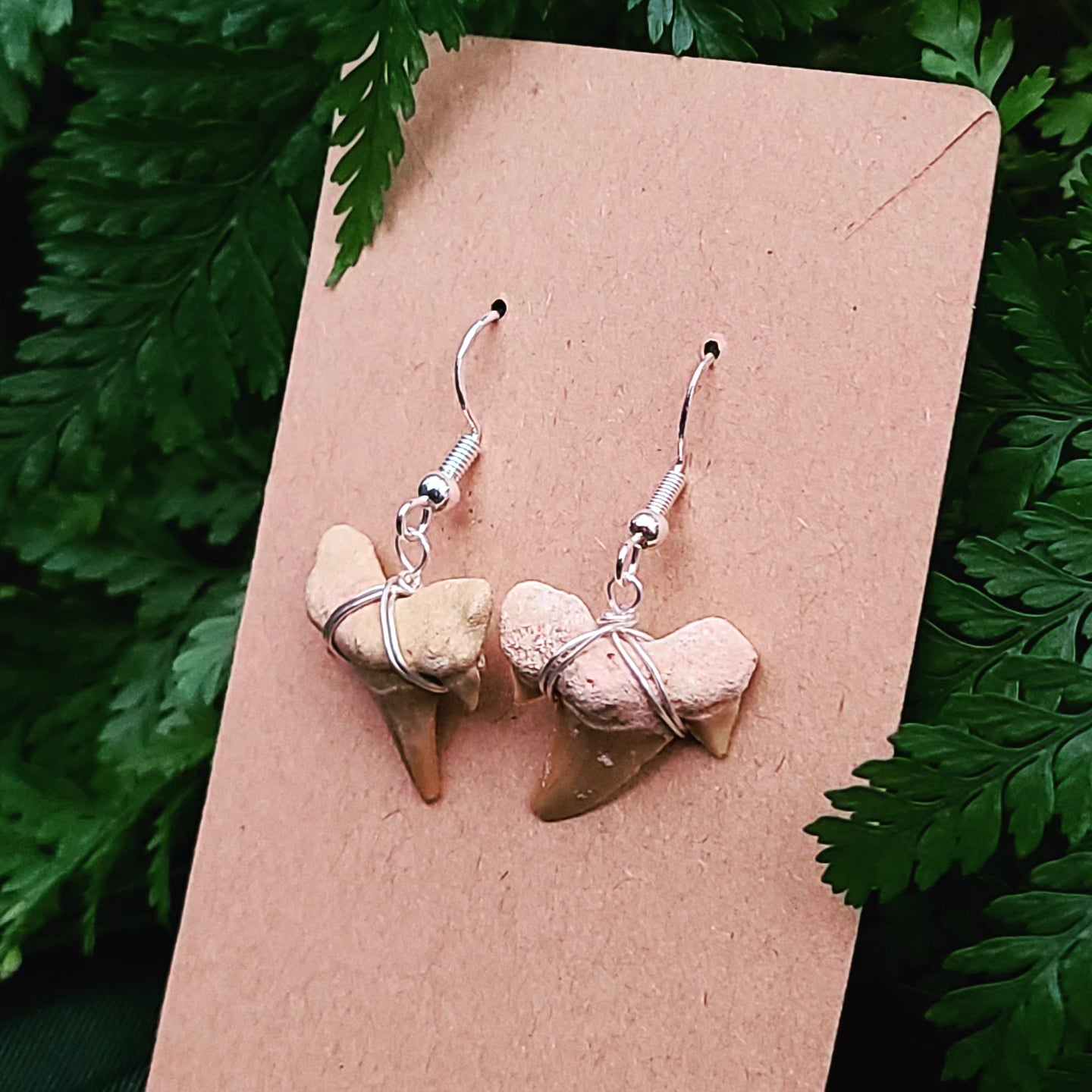 Handwrapped shark tooth earrings. Silver hypoallergenic hook earrings with silicone stops.