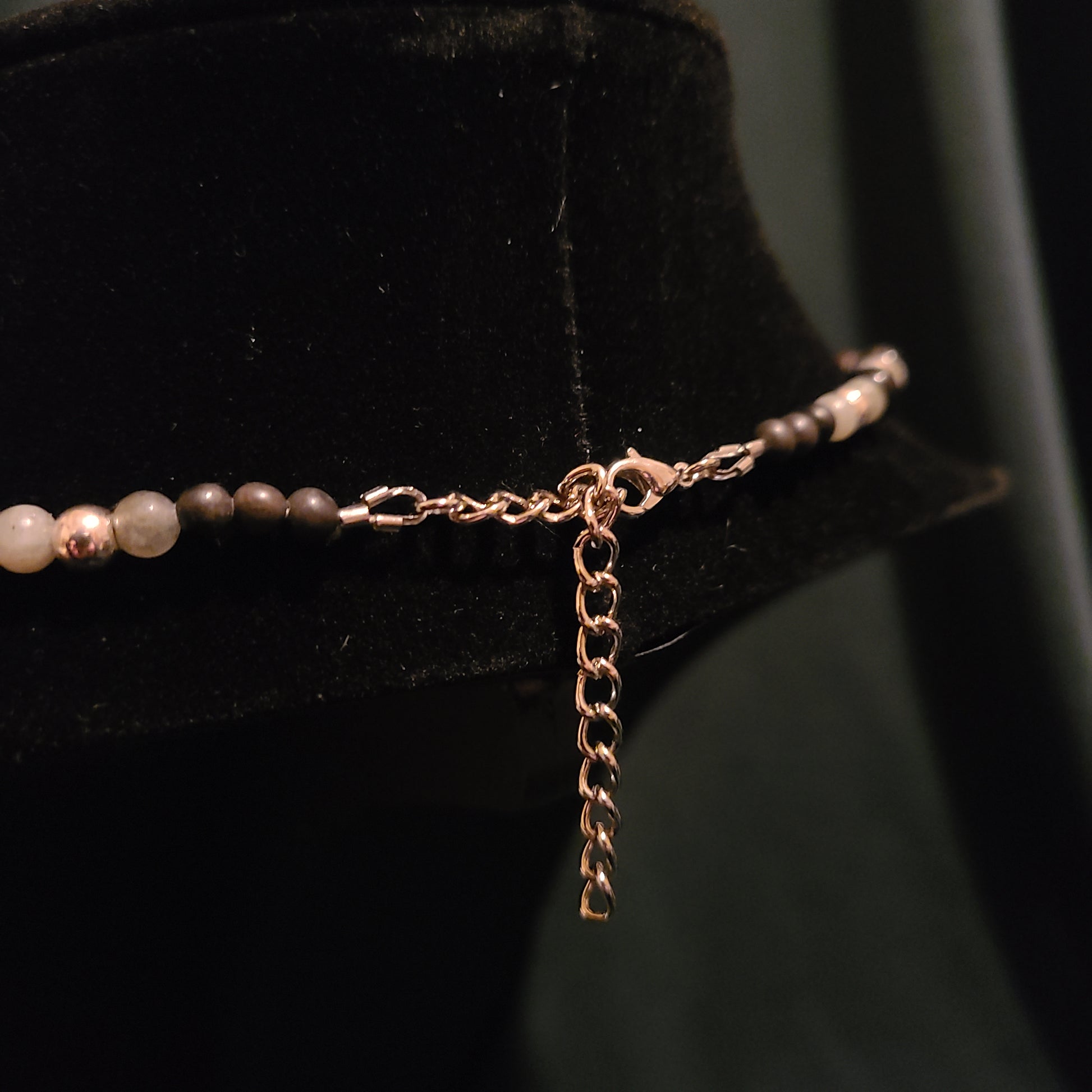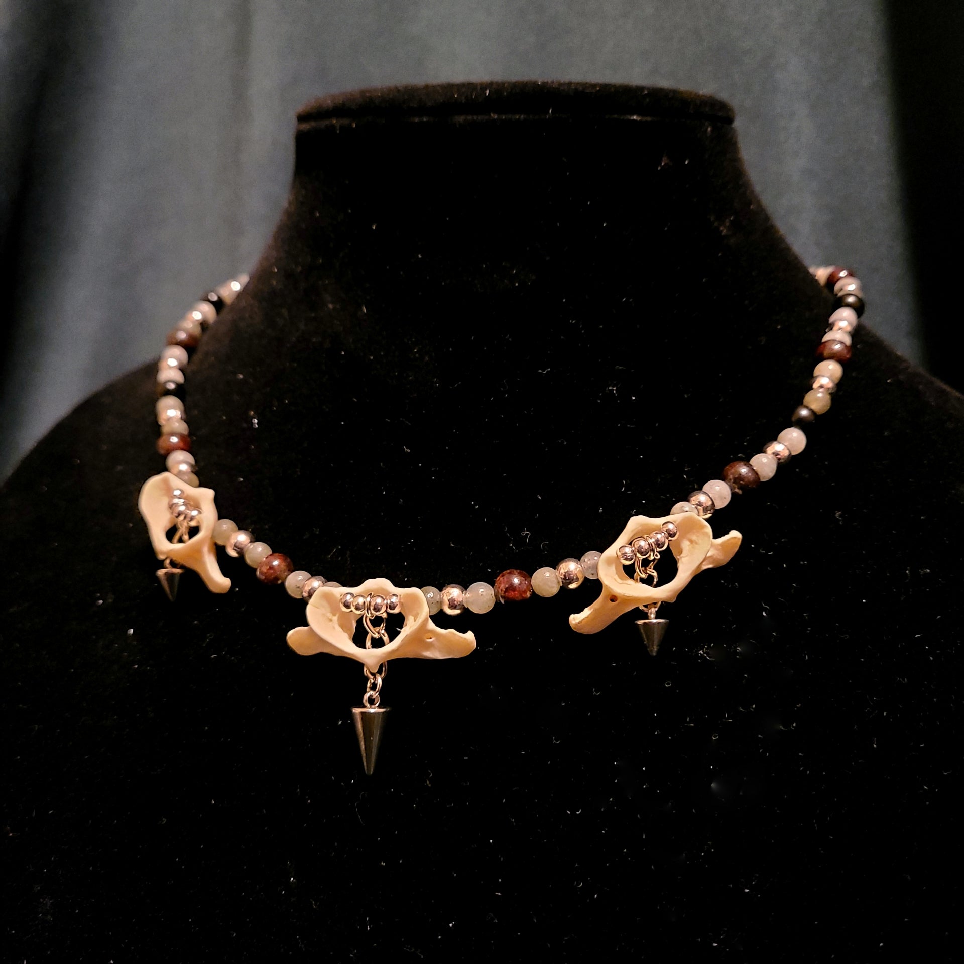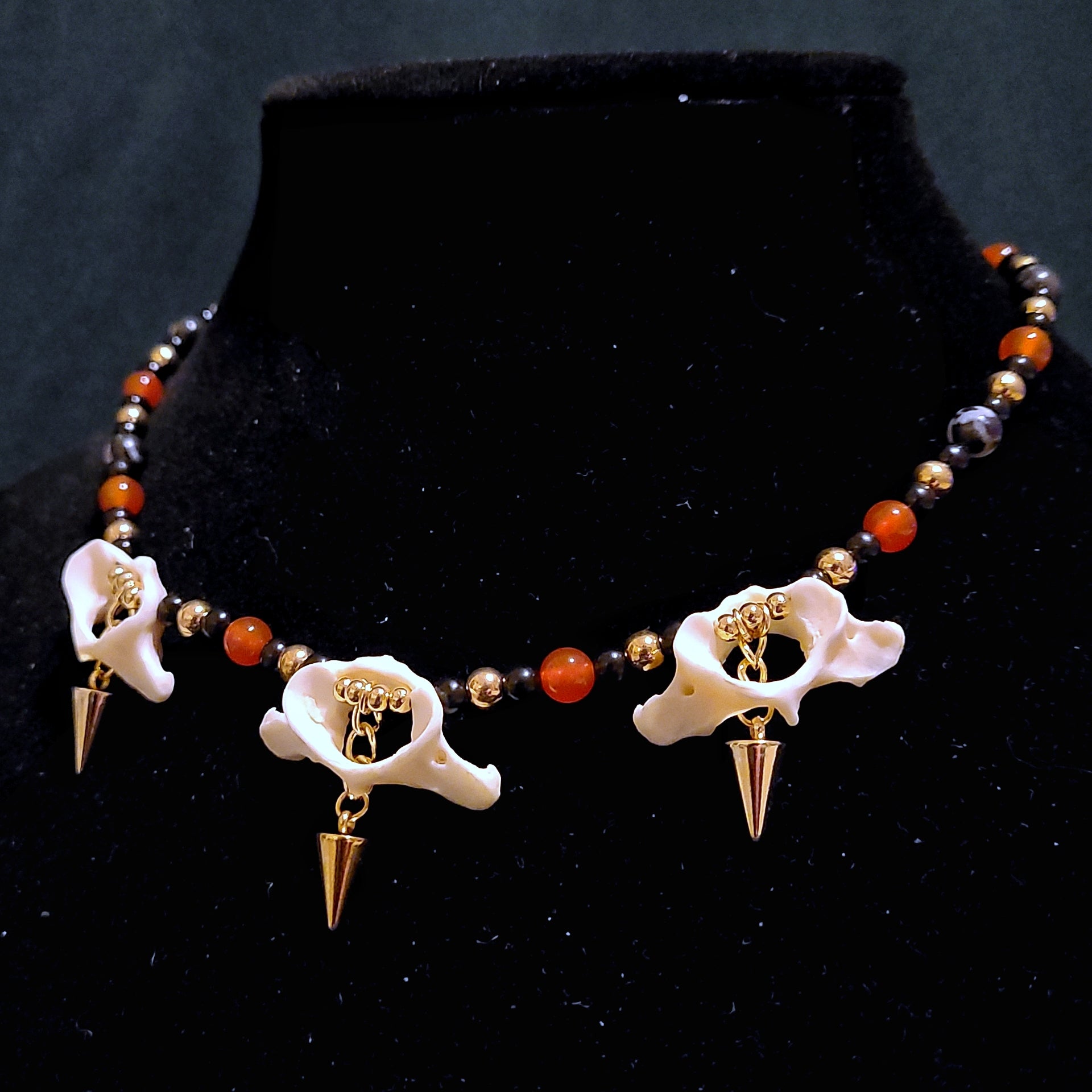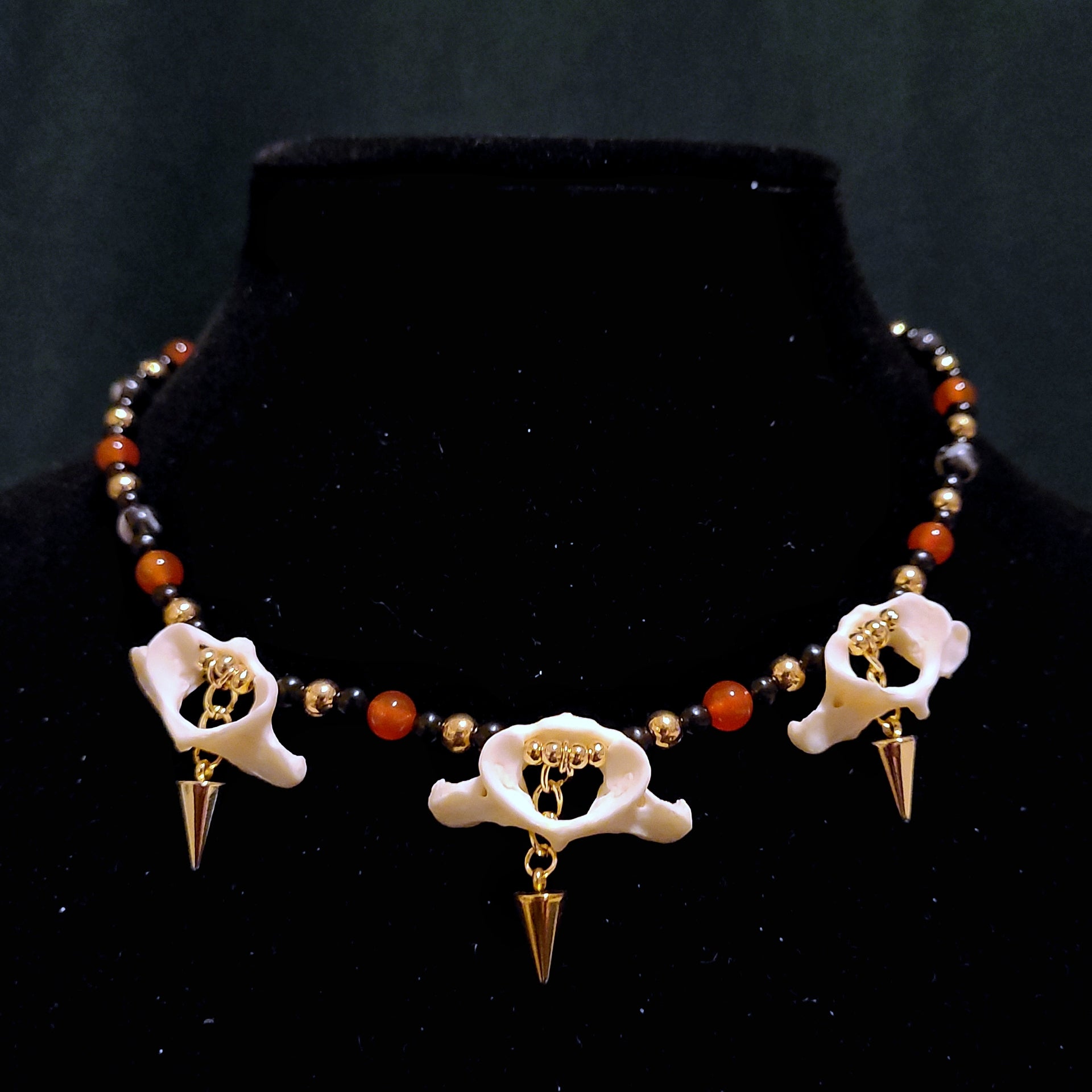 Gold necklace features obsidian, carnelian, zebra jasper, and spike charms.