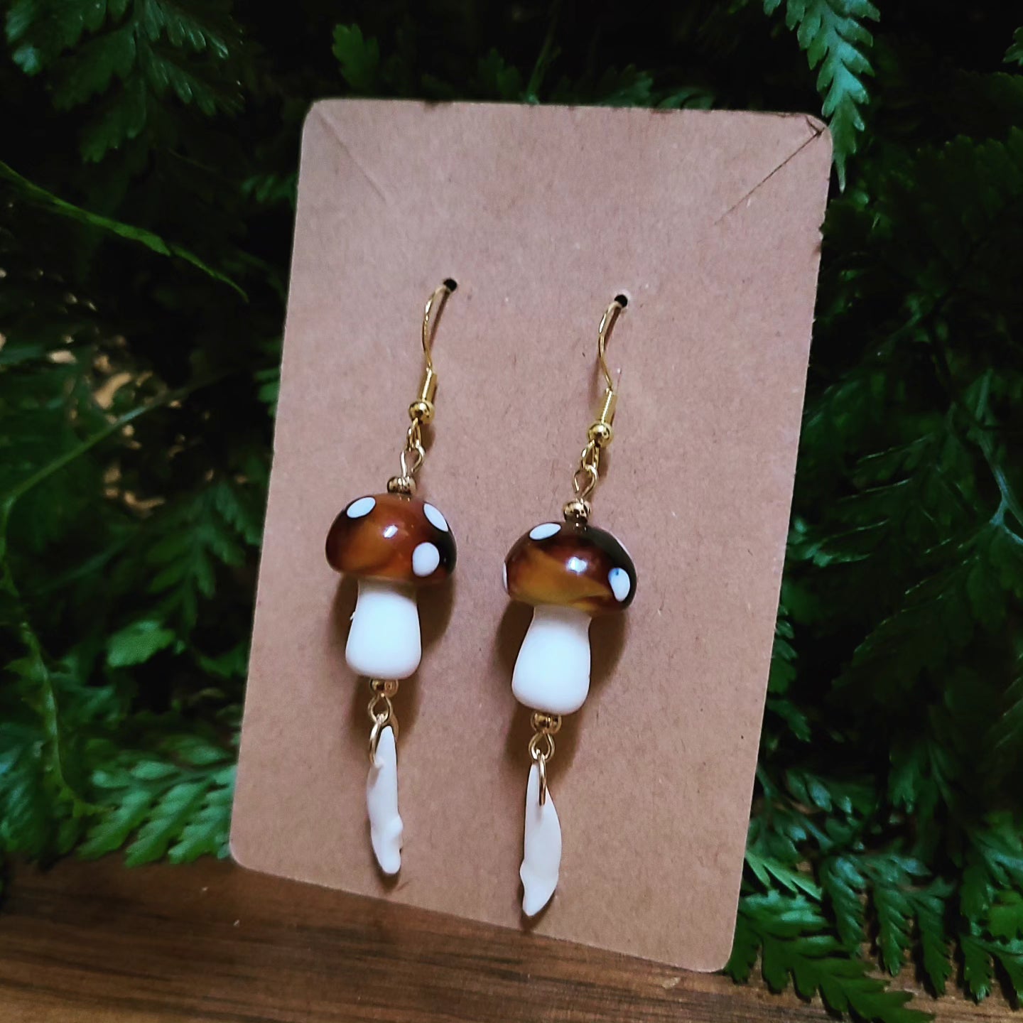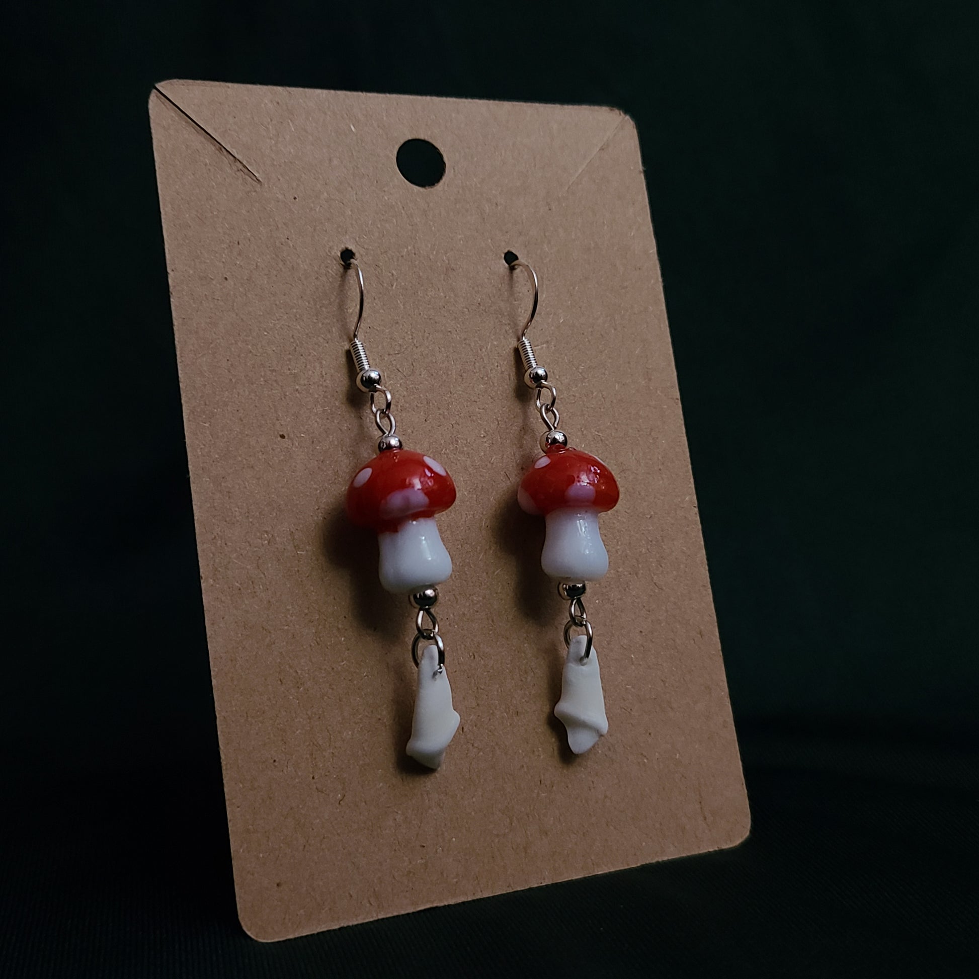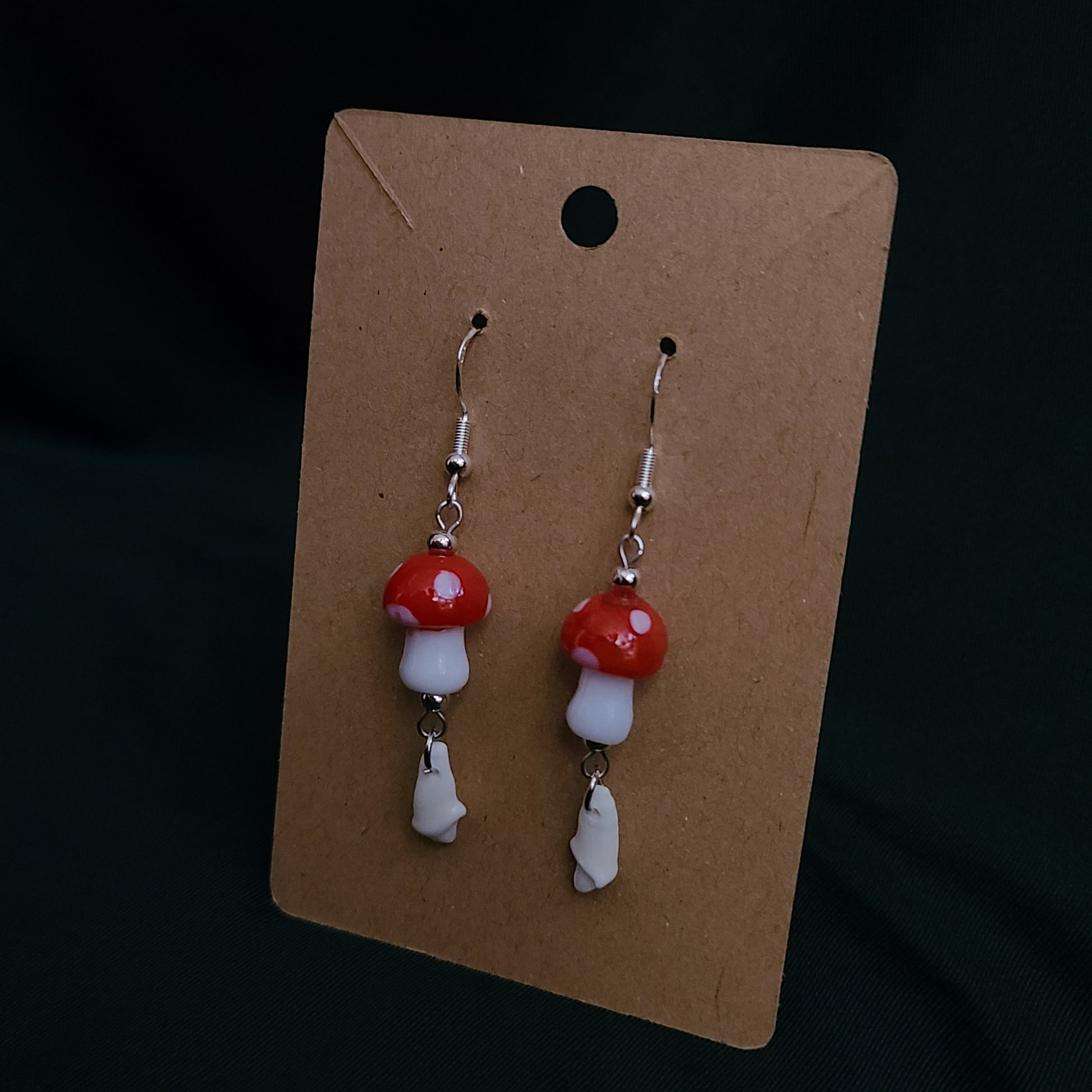 These earrings feature paired Raccoon premolars with mushroom charms. Hypoallergenic hook earrings with silicone stops. Available in either gold or silver.