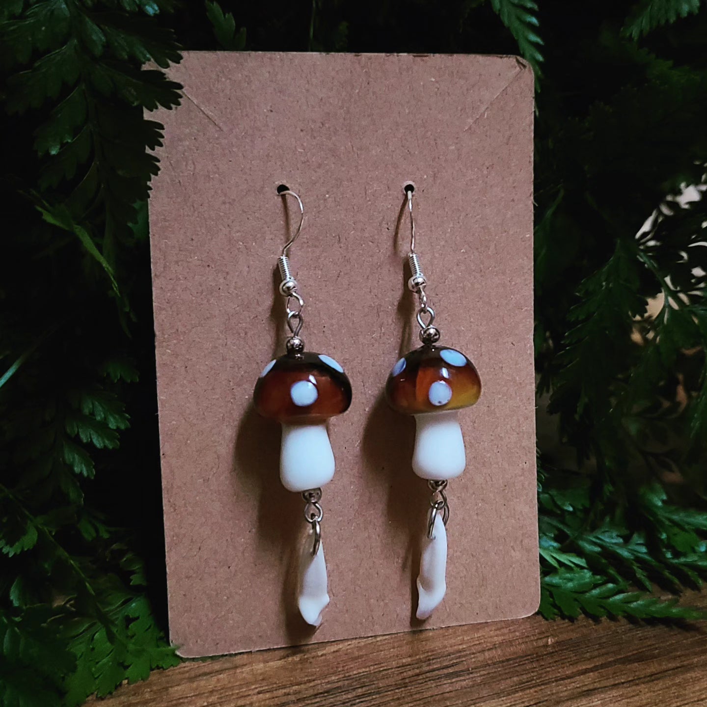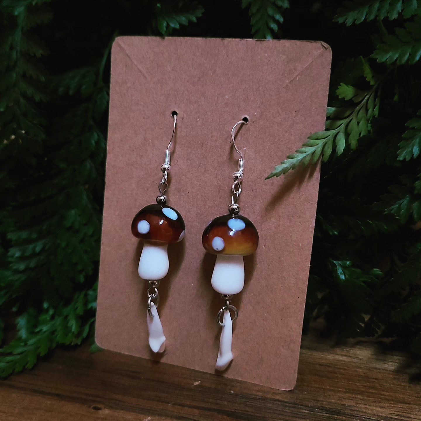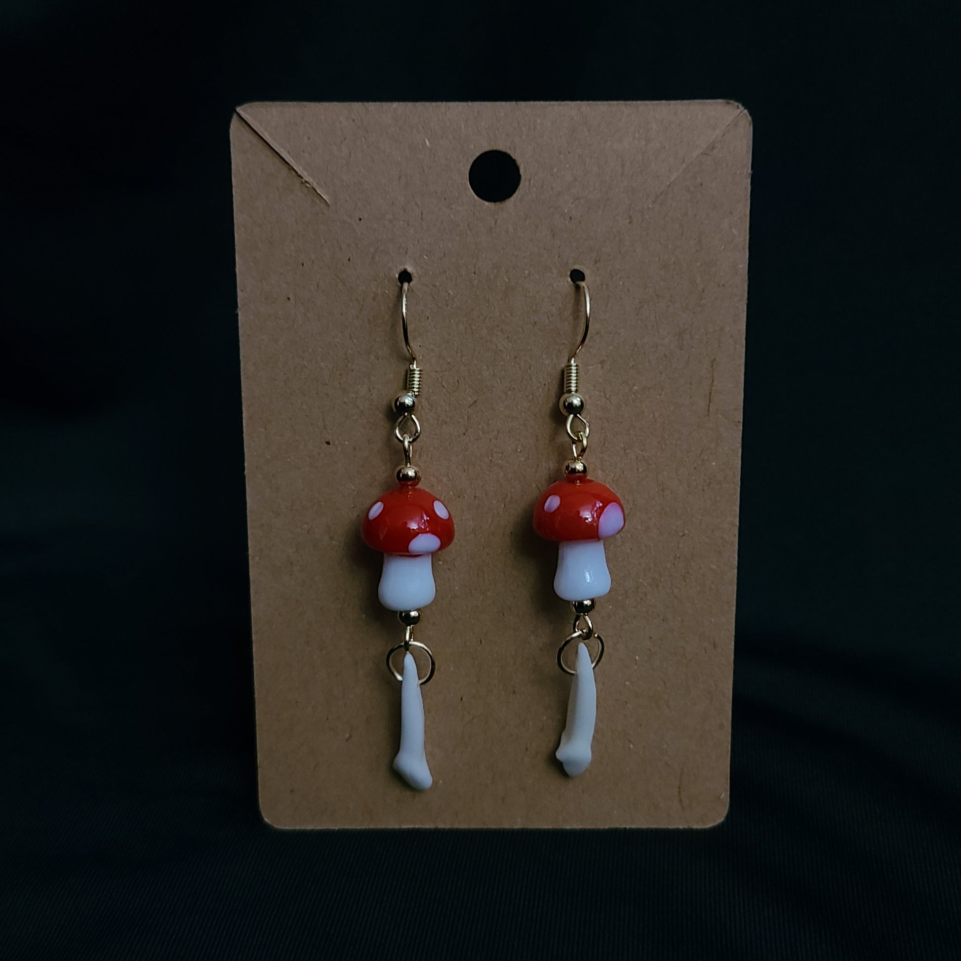 These earrings feature paired Raccoon premolars with mushroom charms. Hypoallergenic hook earrings with silicone stops. Available in either gold or silver.