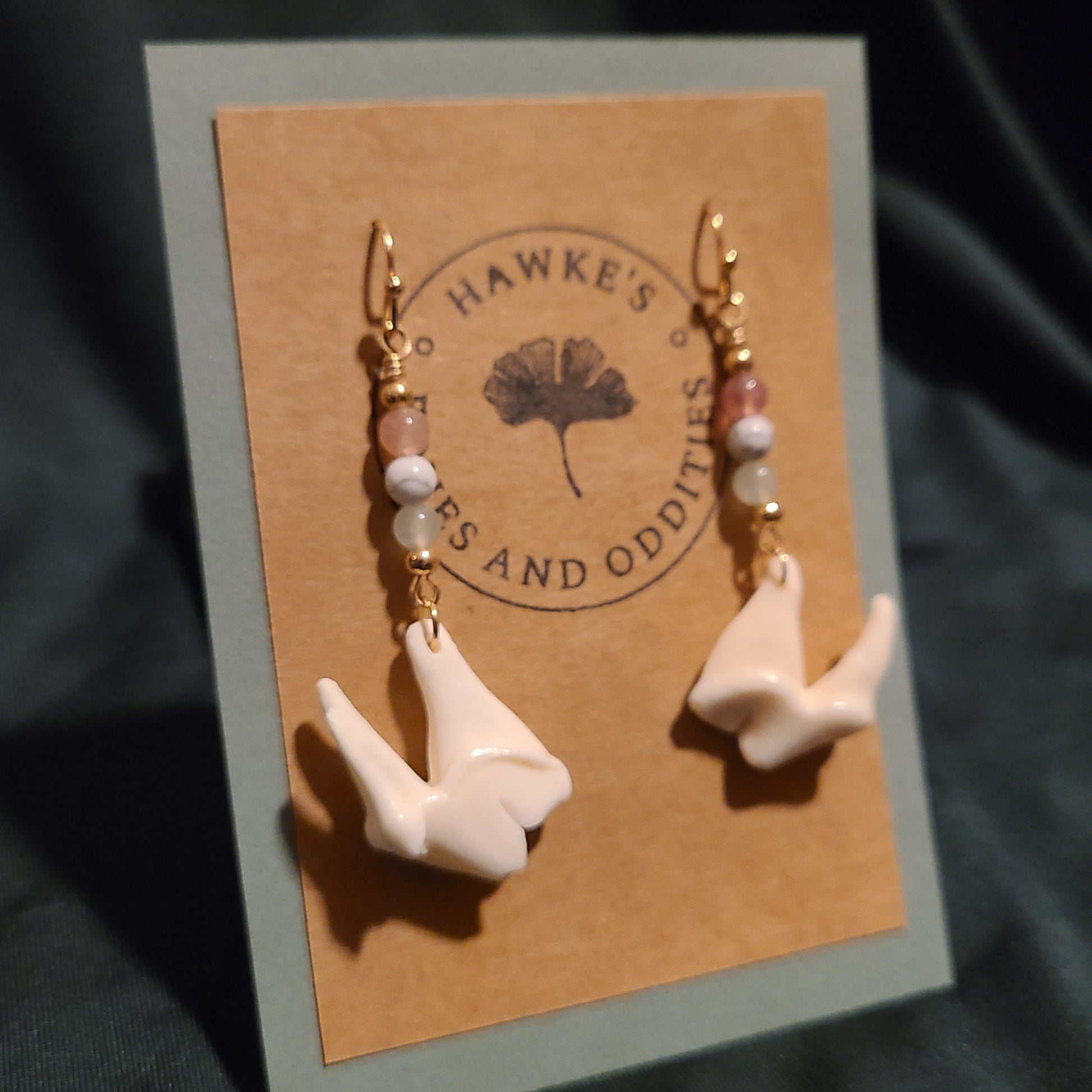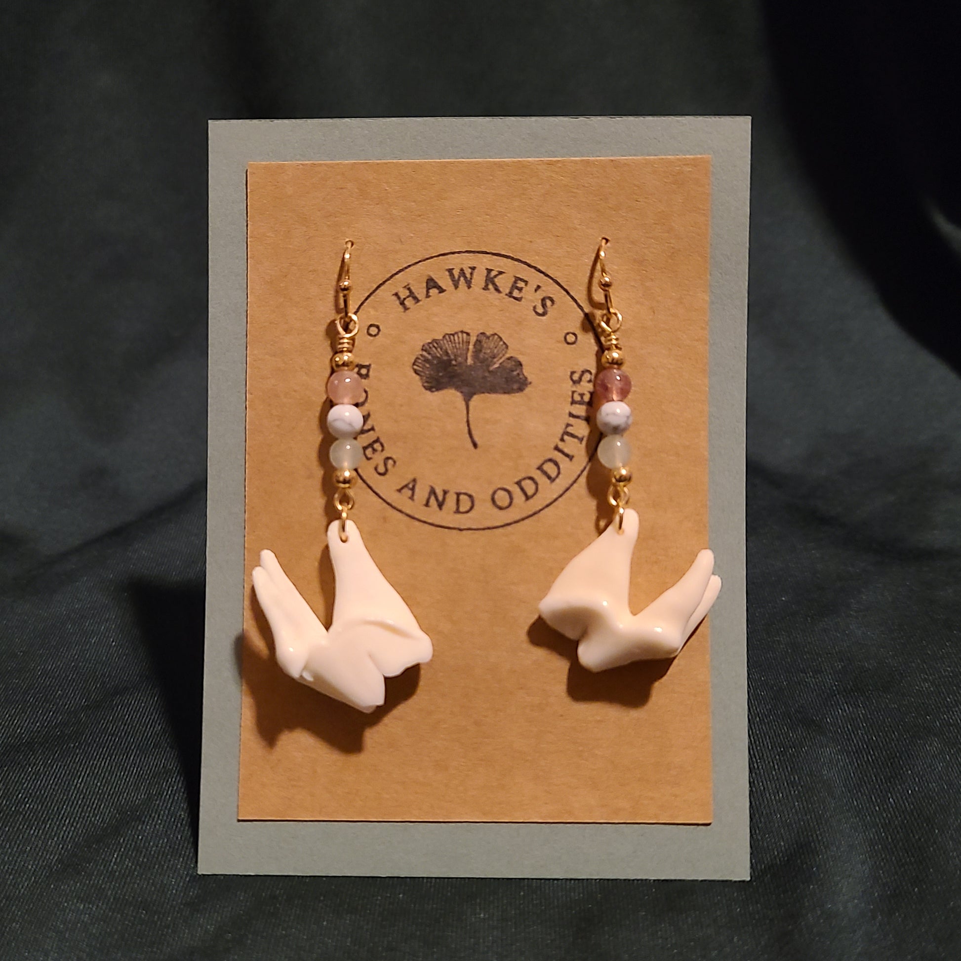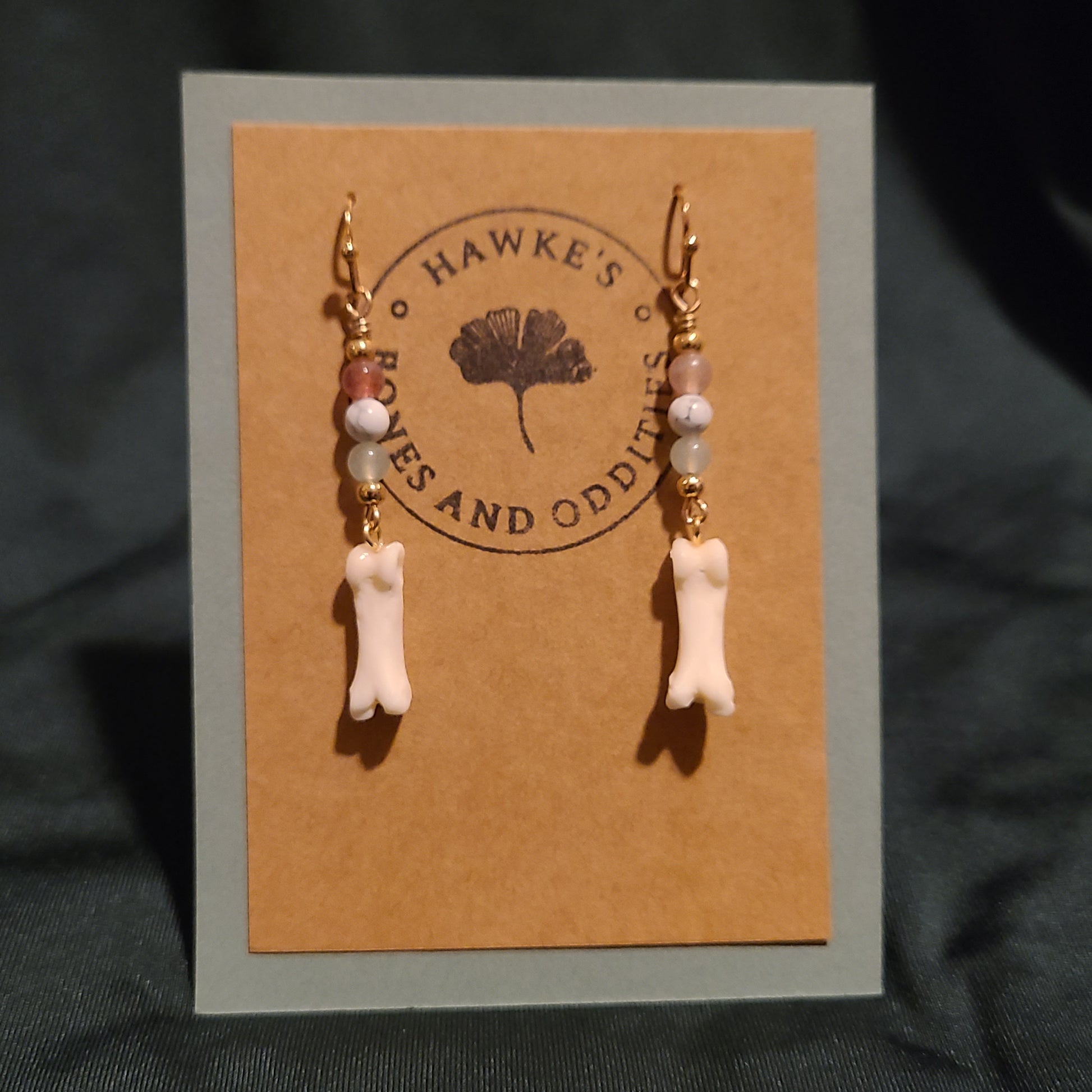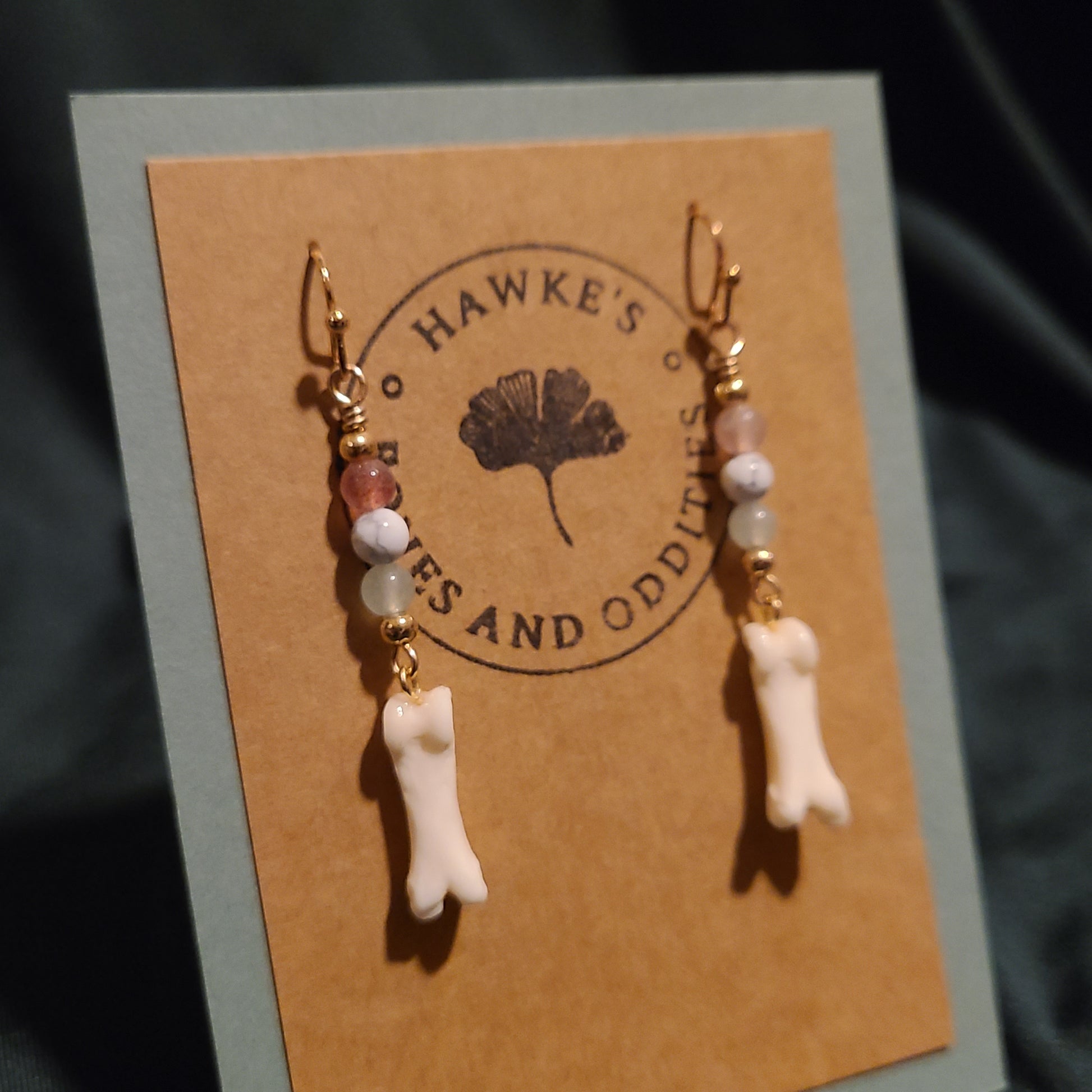 Handmade oddity bone earrings with transgender pride flag color stone beads. Pink is strawberry quartz, white is howlite, and blue is aventurine. Available with gold or silver nickle-free earwire with silicone stops.