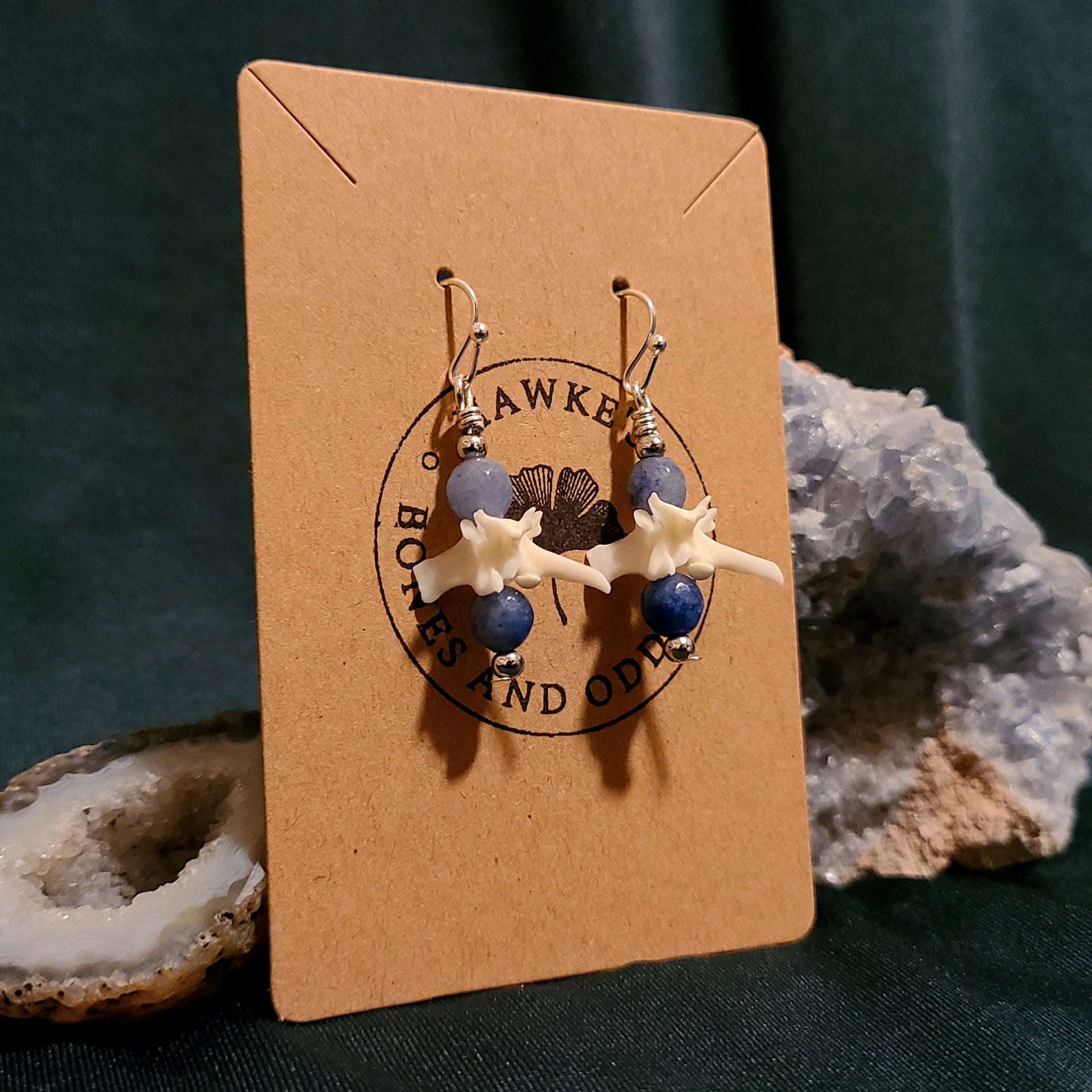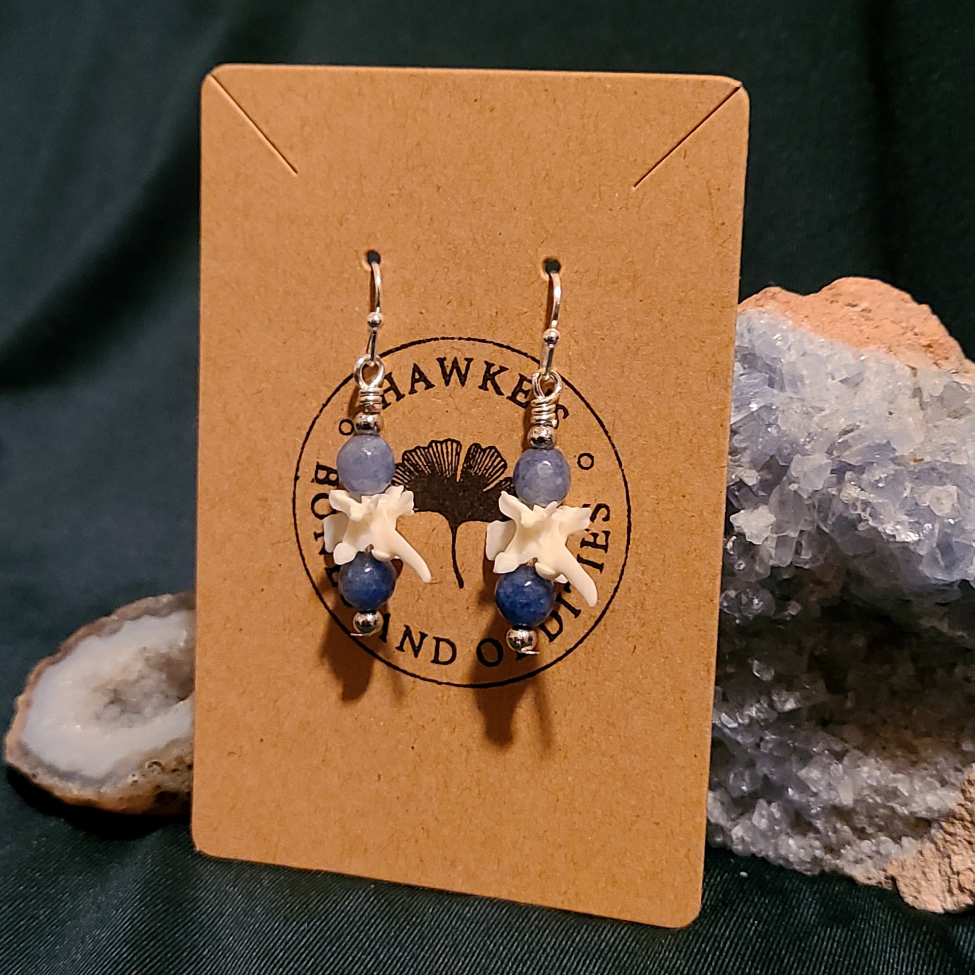 Handmade rattlesnake vertebrae dangle earrings with blue aventurine faceted beads. Hypoallergenic silver hook earrings with silicone stops.